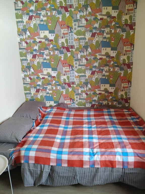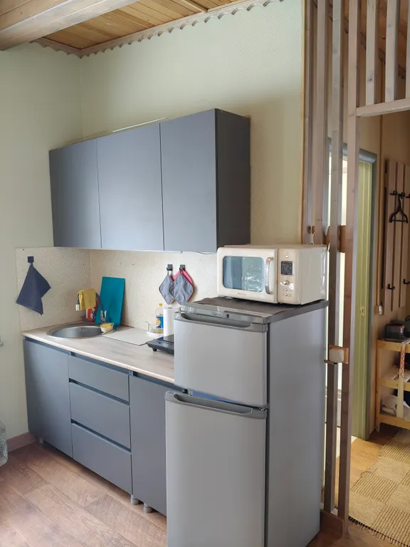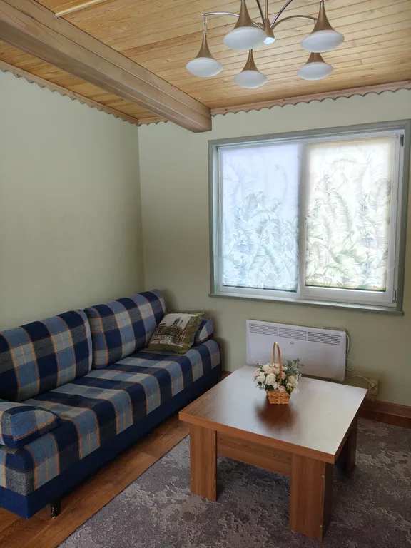В гостиной двуспальный диван, смарт-телевизор, зона кухни с холодильником, микроволновкой, индукционной плиткой и электрочайником. Весь набор посуды для вашего удобства есть.