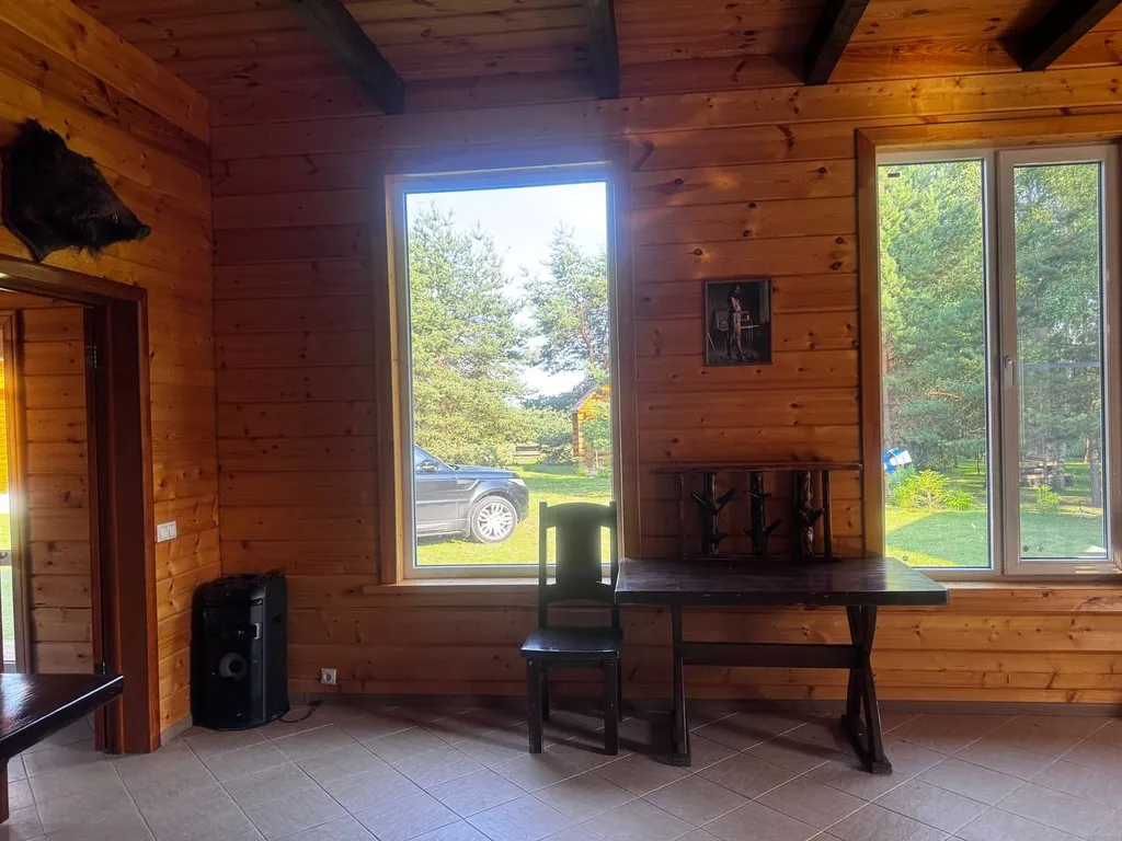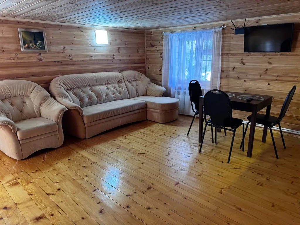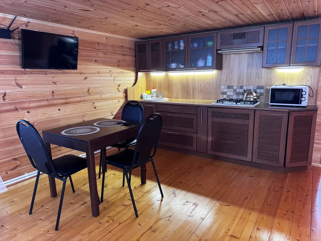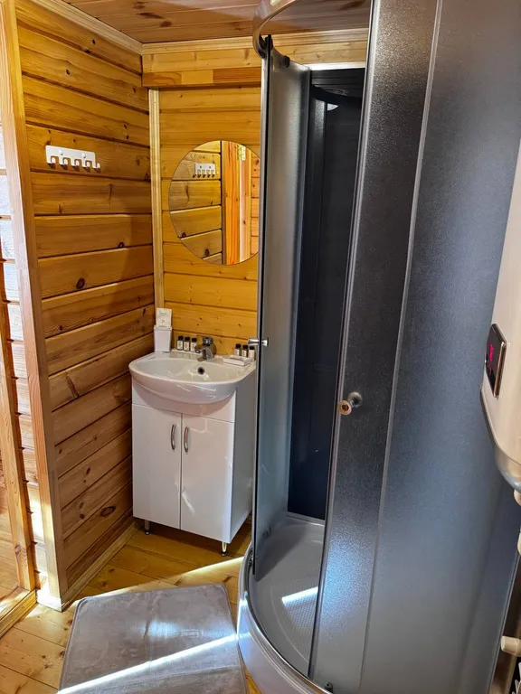 Выполнен из натуральных материалов. Внутри свежий ремонт и большие панорамные окна. Просыпаешься — и кажется, что ты спишь прямо в сосновом лесу.