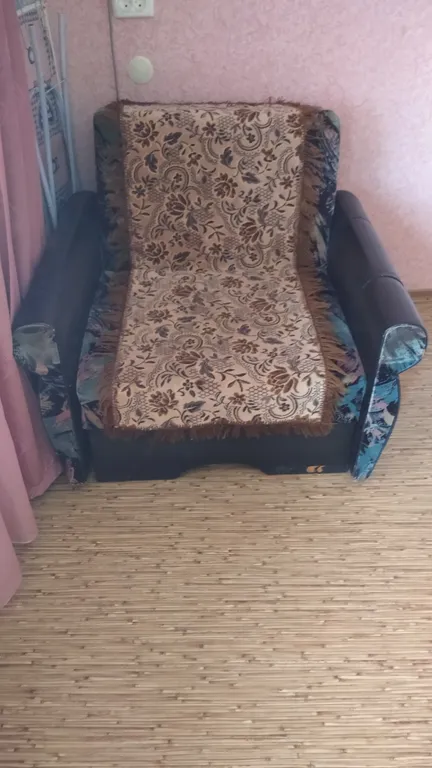 Двухспальная кровать, кресло кровать, шкаф для одежды, кухонный гарнитур, стол обеденный и пуфики.