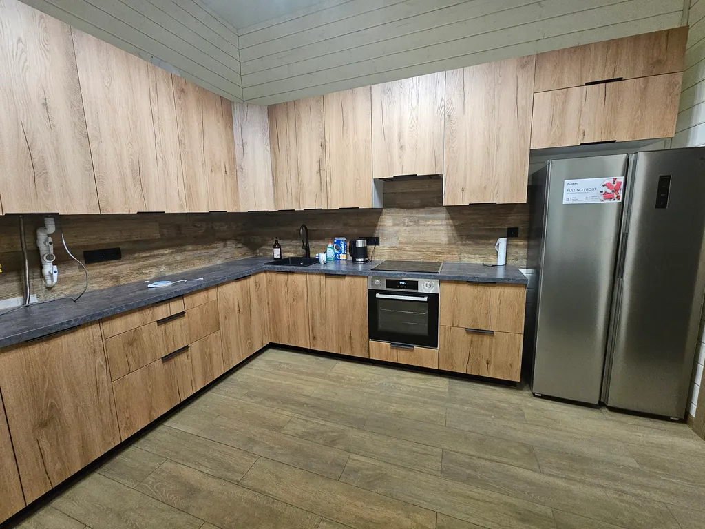 Кухня мечты: полностью оборудована техникой (посудомоечная машина, варочная панель, духовка, СВЧ), а также красивой посудой для торжественных мероприятий.