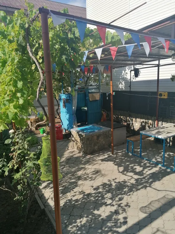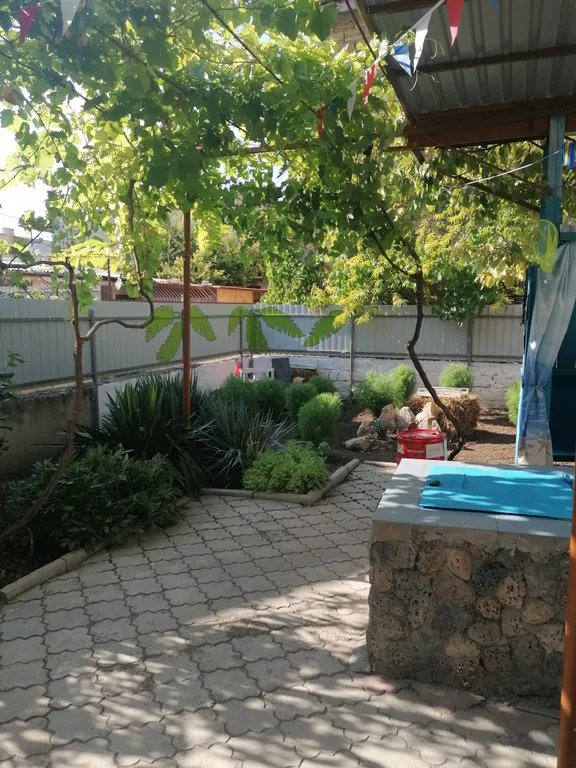 Дом имеет два отдельных входа, состоит из двух симметричных частей, внутри дома есть дверь, которая позволяет объединить обе части дома для общения большой семьи. В то же время можно изолироваться друг от друга для уединения и отдыха. Оба выхода выходят в общий двор с летним душем, фруктовыми деревьями и виноградником. При желании можно пожарить шашлык, мангал предоставляется. С противоположной стороны дома есть парковочные места для двух машин.