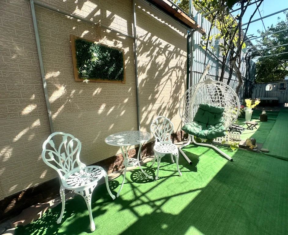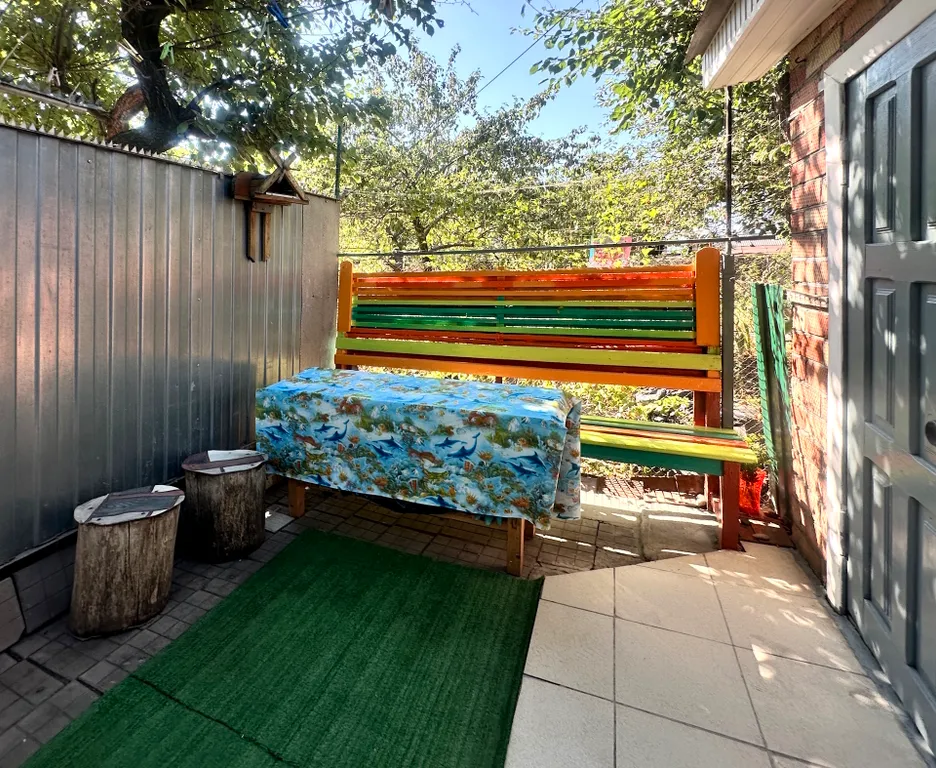 Полностью освещённая территория имеет 2 зоны отдыха с мебелью, мангальную зону, батут, качели.
