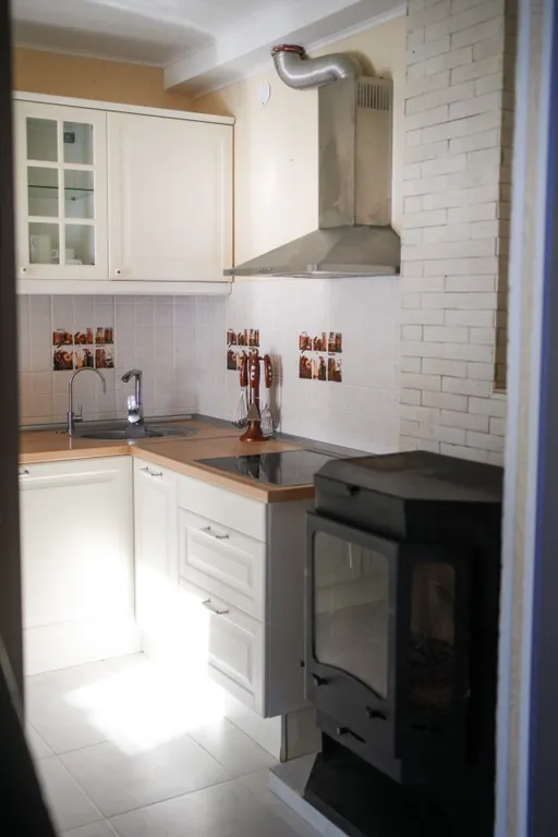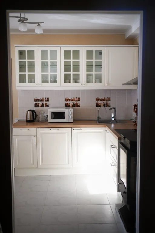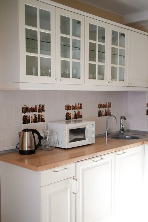 Кухонная зона: холодильник, чайник, свч-печь, индукционная плита, духовка, набор посуды, приборы.