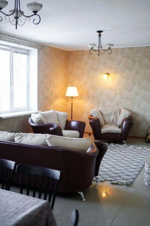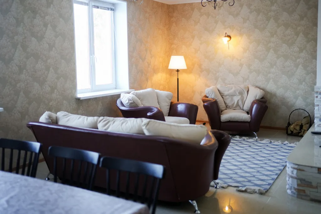 В гостиной: мягкая мебель, кабельное тв, на первом и втором этажах благоустроенный wc, душ, фен, полотенца.