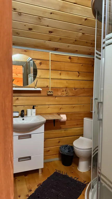 Диван- софа, стол со стульями, полотенца, постельное белье, душевая кабина, с/у, раковина, вода горячая, мини кухня с холодильником,