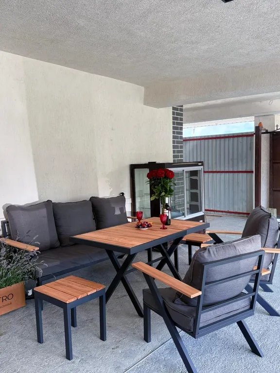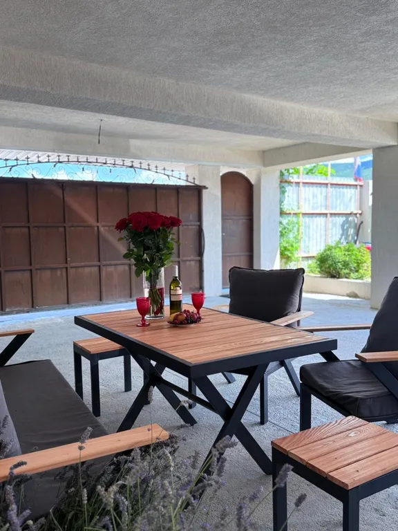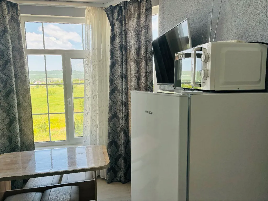 Полностью оборудованная кухня: небольшой набор посуды, свой санузел. Бетонный подъезд к дому, рядом магазин, аптека.