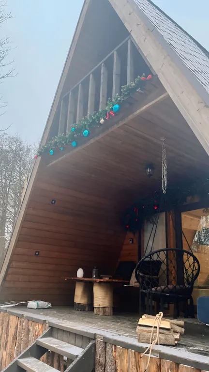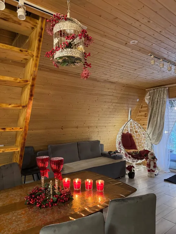 Двухэтажный просторный коттедж, выполненный из натурального дерева, с продуманной планировкой для больших групп.
