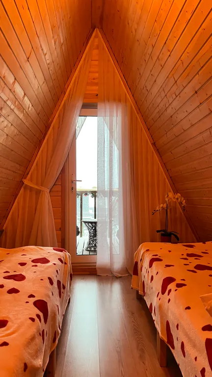 Спальня №1: две односпальные кровати. Из комнаты есть выход на собственный крытый балкон с видом на лес — идеальное место для утреннего кофе.