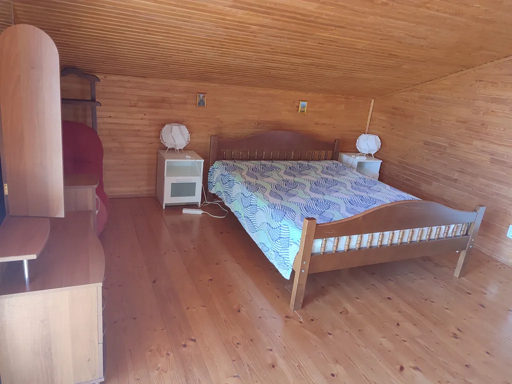 На втором этаже расположены 3 спальни. В большой комнате с выходом на балкон, обращенный в сторону моря, есть большая удобная двуспальная кровать, шкаф для одежды, комод, трельяж, телевизор со спутниковым ресивером.
