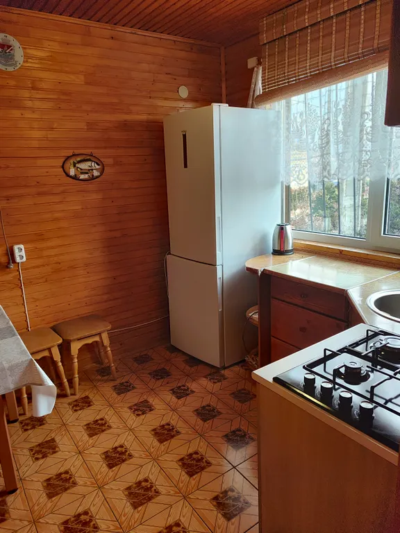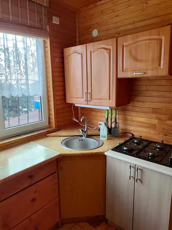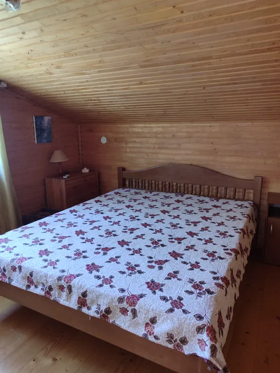 Сам дом построен из экологически чистого бруса карпатской ели по современной финской технологии. В доме два этажа, на первом этаже гостиная с диваном, креслами, обеденным столом и телевизором со спутниковым ресивером и проигрывателем CD. Здесь также расположена уютная кухня с газовой плитой, микроволновкой, холодильником, есть стиральная машинка. Санузел с душевой кабинкой также находится на первом этаже. При необходимости диван в гостиной может использоваться как дополнительное спальное место для двоих.
