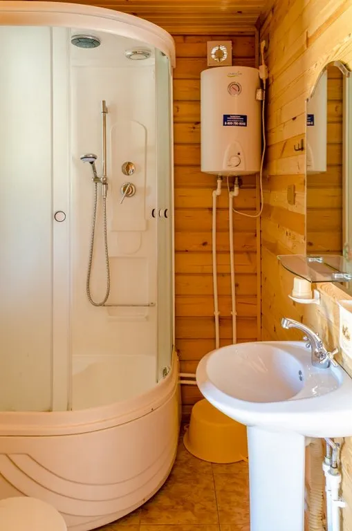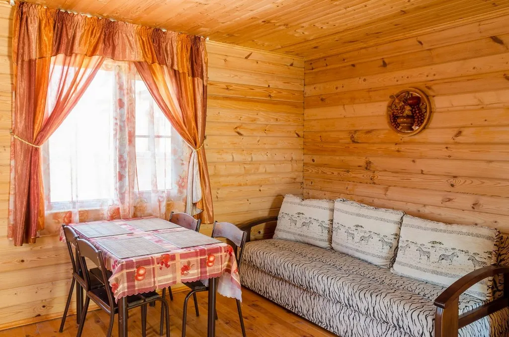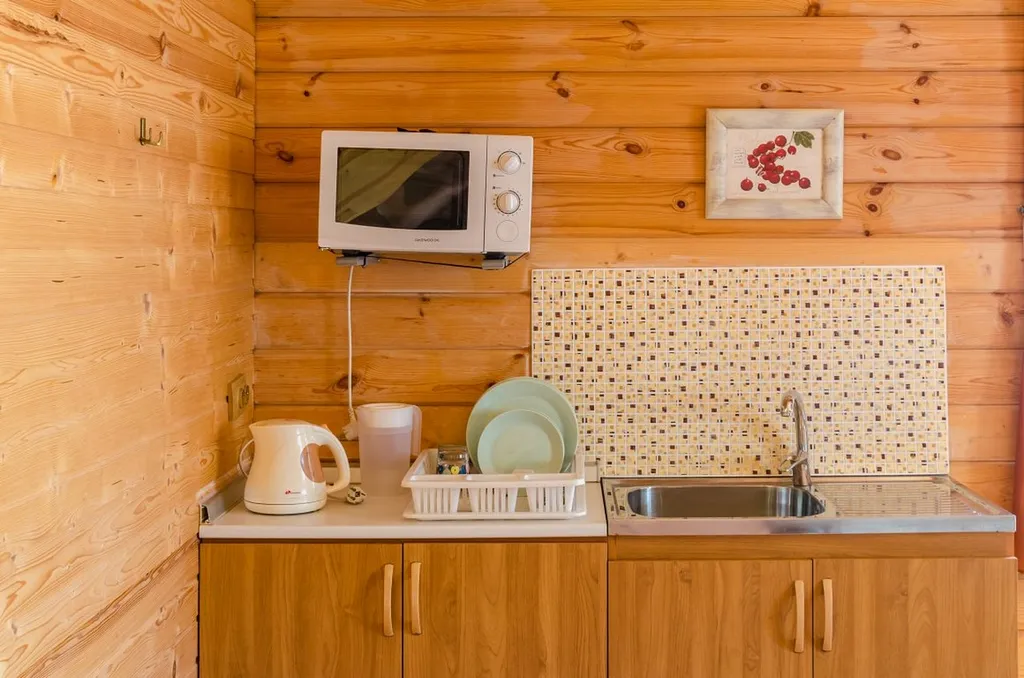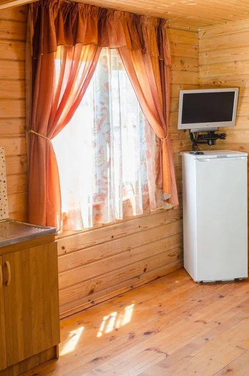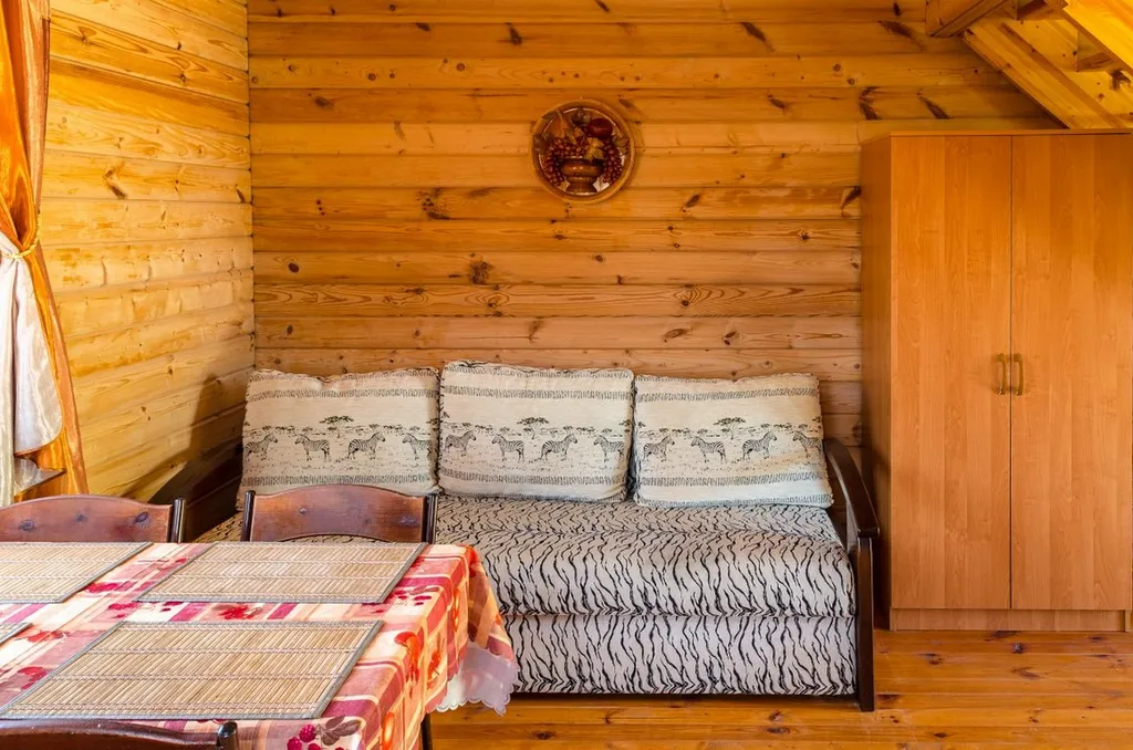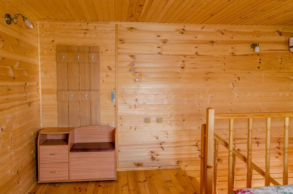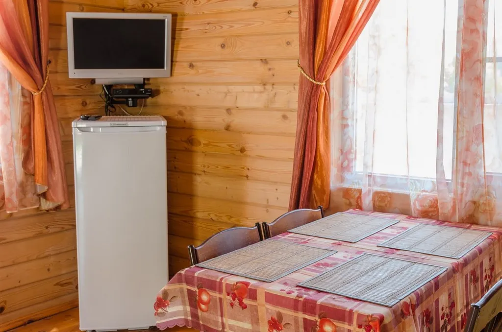 На первом уровне гостиная: мини-кухня с микроволновой печью и эл.чайником, холодильник, посуда. Диван-кровать, шкаф для одежды, ванная комната с душевой кабиной. ТВ (телекарта), обеденный стол со стульями.
