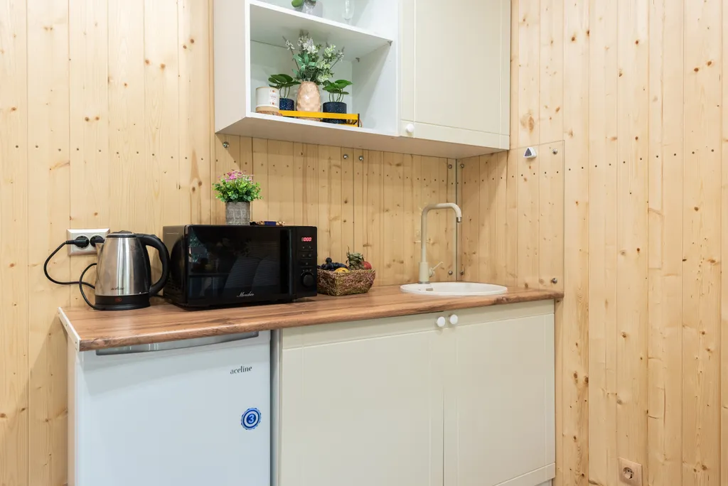 * Мини-кухня, чайник, посуда, холодильник, микроволновая печь, электрическая плита