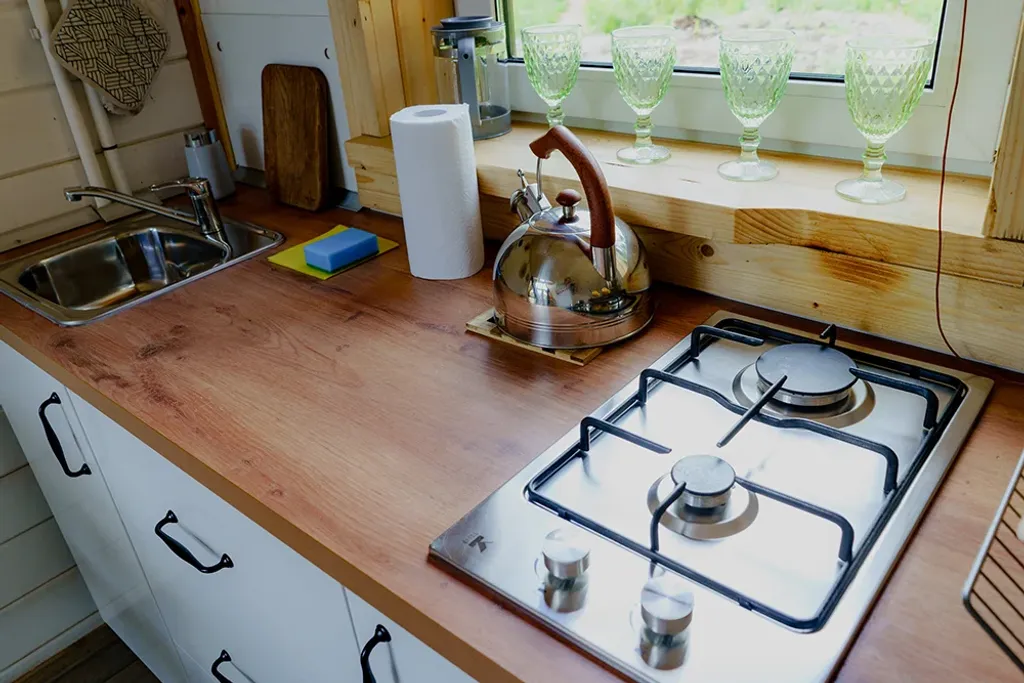 Оборудованная кухня: вся посуда, газовая плита, холодильник, чайник