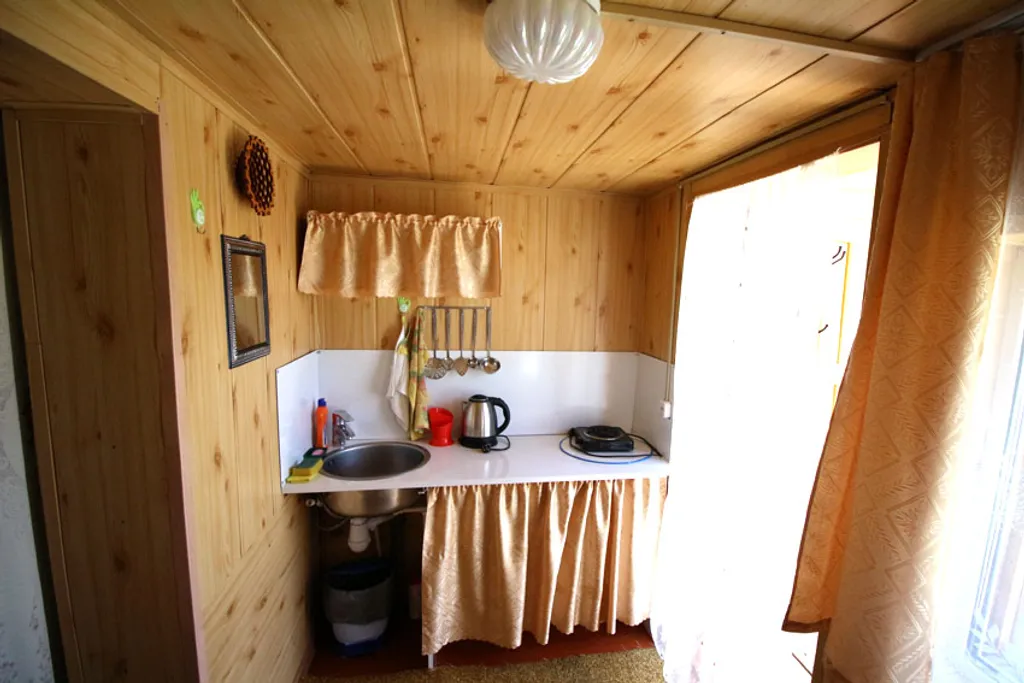 Прохладная комната с 2мя односпальными кроватями и двуспальным диваном. Кухня оборудована всем необходимым для приготовления пищи.