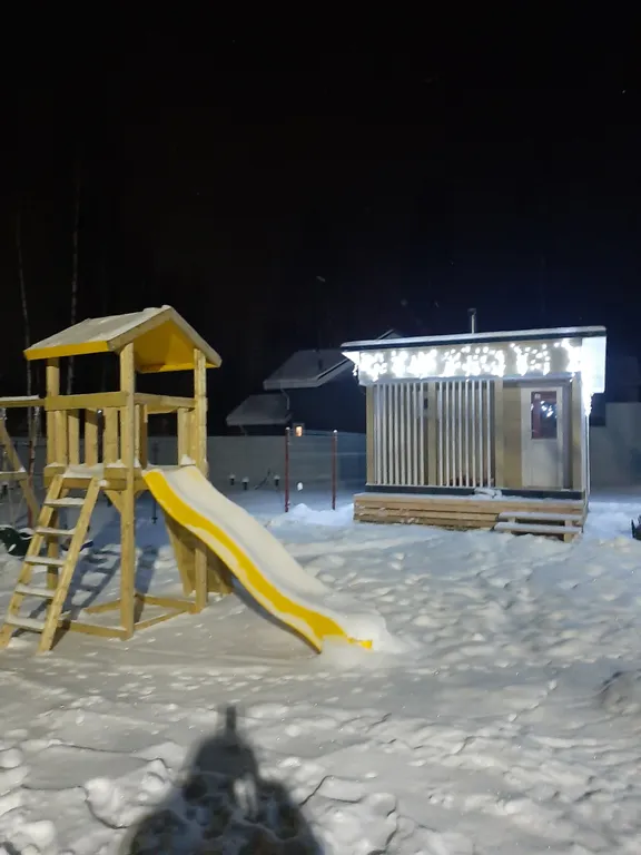 Большое парковочное место на 3 машины. Детская площадка с качелями, горкой и песочницей.