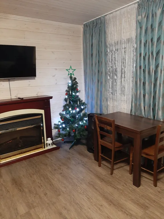 Кухня просторная + гостиная с двумя раскладывающимися диванами, камином и телевизором — 60 кв. М. Большая терраса на первом этаже. На кухне установлена вся бытовая техника, включая посудомоечную машину, духовку, чайник, мультиварку, кофеварку, микроволновую печь и плиту. Стиральная машина в сан. Узле. Бойлер с горячей водой. Дом подключен к центральному водопроводу, вода из-под крана — питьевая (фильтр).