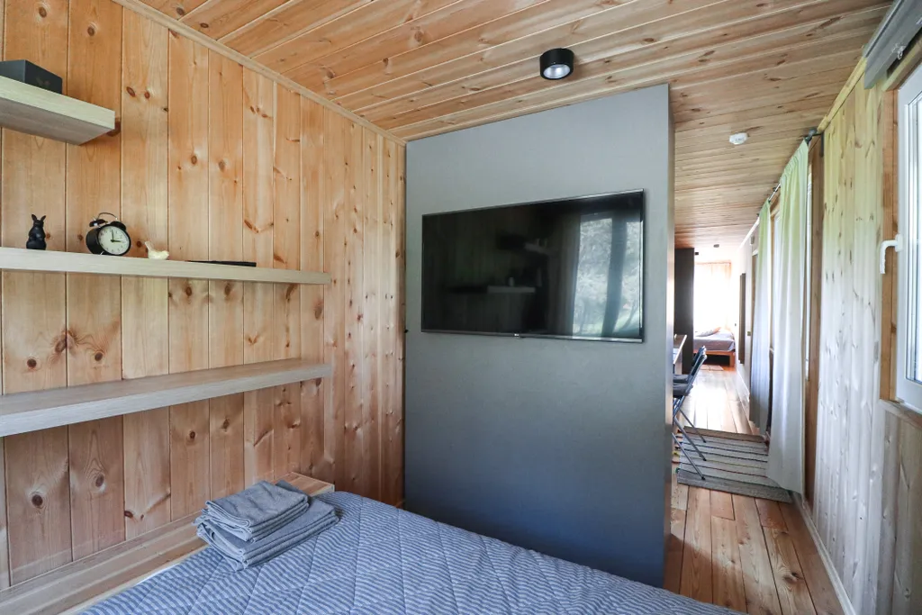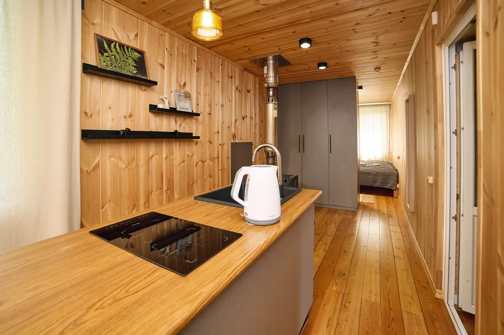 - Холодильник, индукционная плита, раковина, электрический чайник, набор посуды и чайные принадлежности