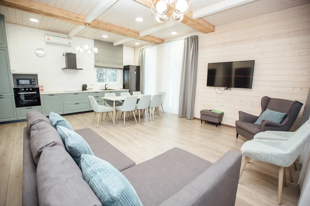 Оснащение дома: 2 двуспальные кровати, 4 полутороспальные кровати и диван-кровать, шкаф для одежды, зеркало, стол, стулья, тумба для обуви, вешалки. В ванной комнате располагается душевая кабина, ванная, санузел, предоставляются полотенца и гостиничная парфюмерия.
