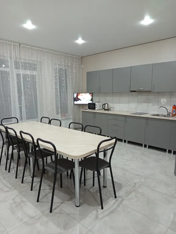 Просторная кухня со всем необходимым (посуда микроволновая печь чайник холодильник).