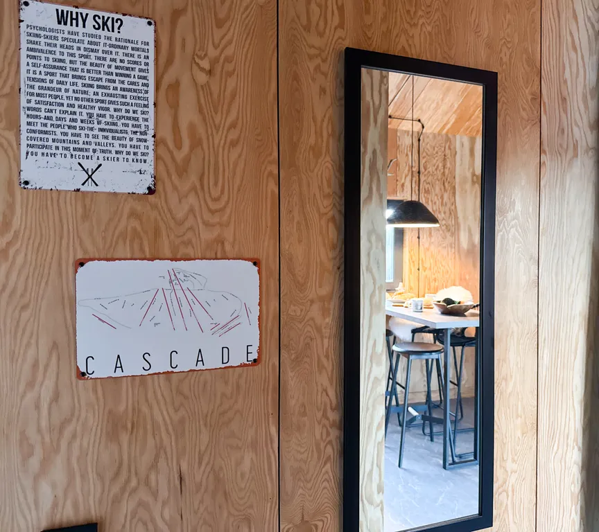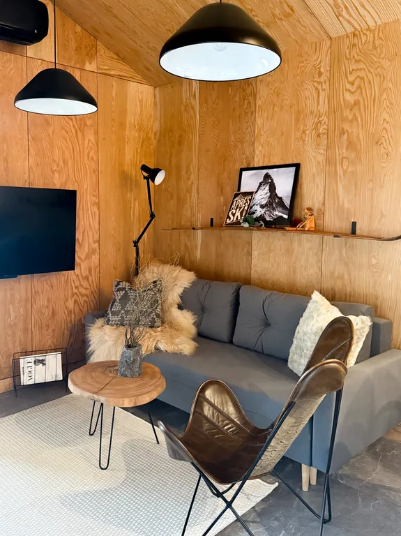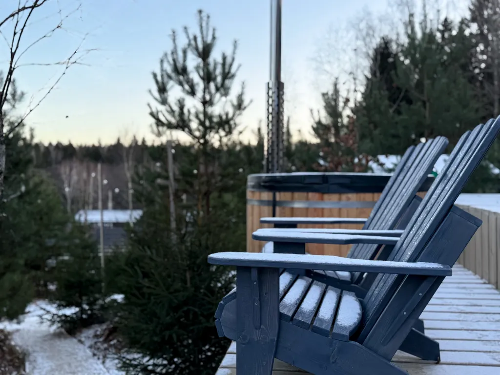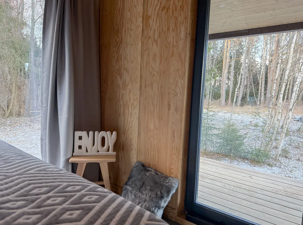 В доме отдельная спальня с двуспальной кроватью, просторная кухня-гостиная с большим раскладным диваном и камином. Панорамные окна дома выходят на лес и большую террасу.