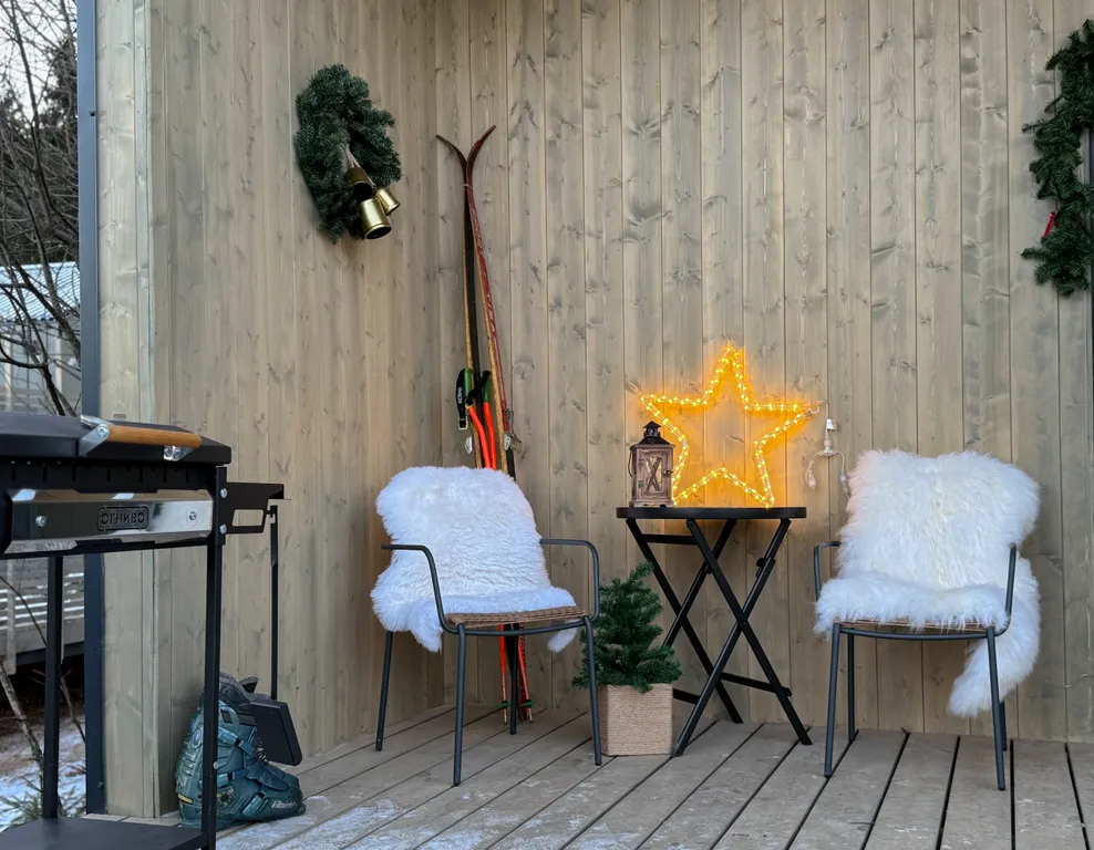 На территории есть мангальная зона и большая терраса с уличной мебелью.