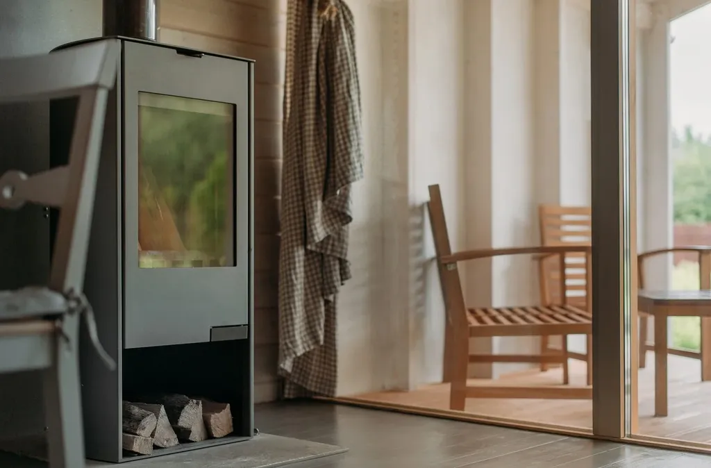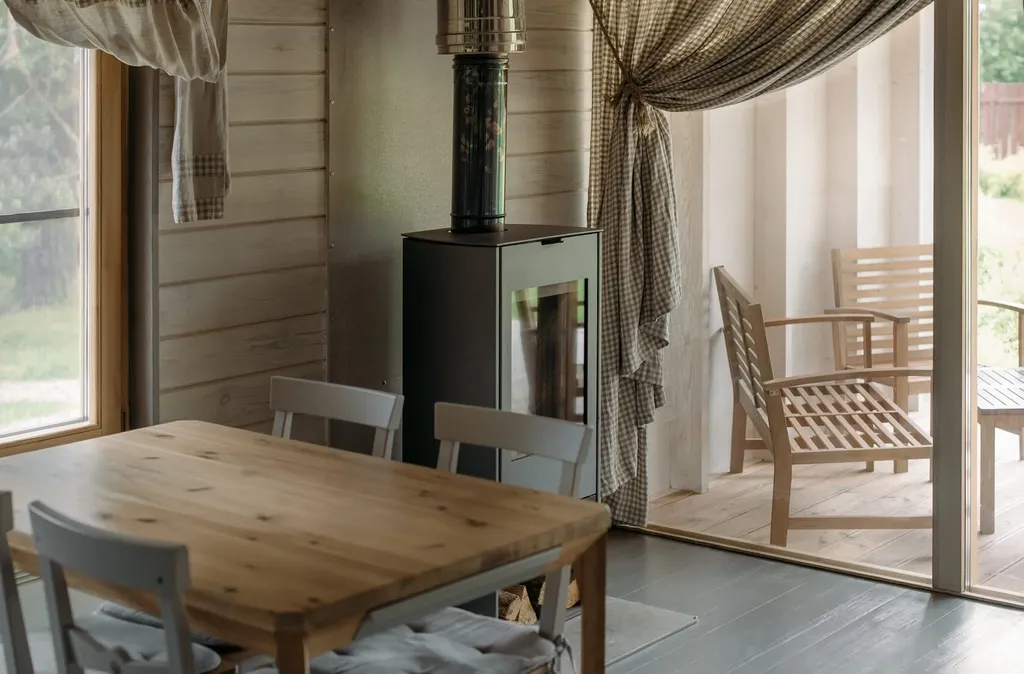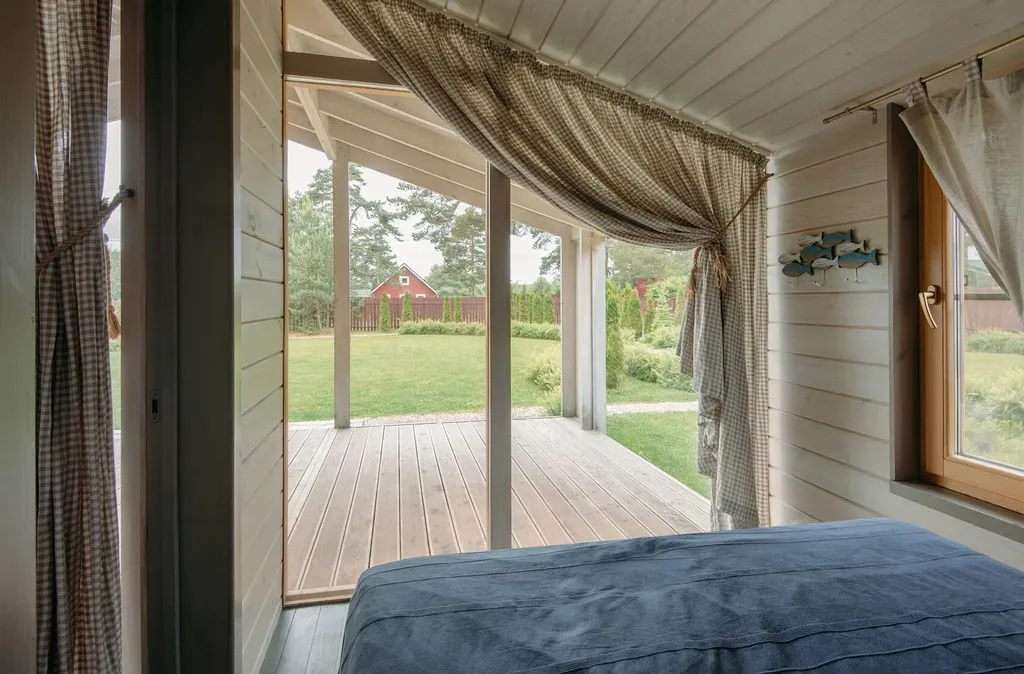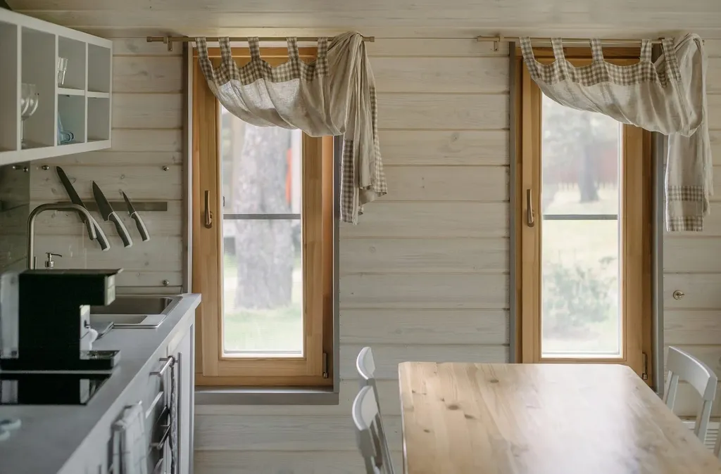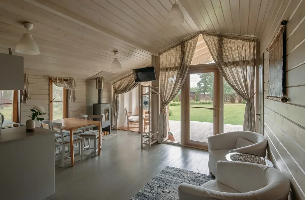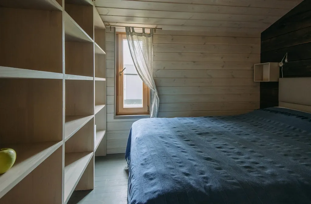 Дом состоит из трех жилых помещений: спальня со стеллажом для одежды и двуспальной кроватью (140х200 см); спальня с двуспальной кроватью (140х200 см) с прекрасным видом из панорамного окна; удобная кухня-столовая с камином, оборудованная всем необходимым для отдыха и приготовления еды.