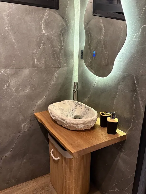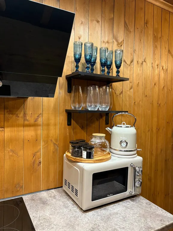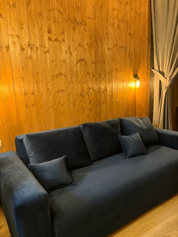 Интерьер выполнен в современном стиле с использованием натуральных материалов, создающих тёплую атмосферу. На первом этаже расположена кухня с современной техникой и обеденной зоной. Гостиная оборудована удобным диваном и телевизором.