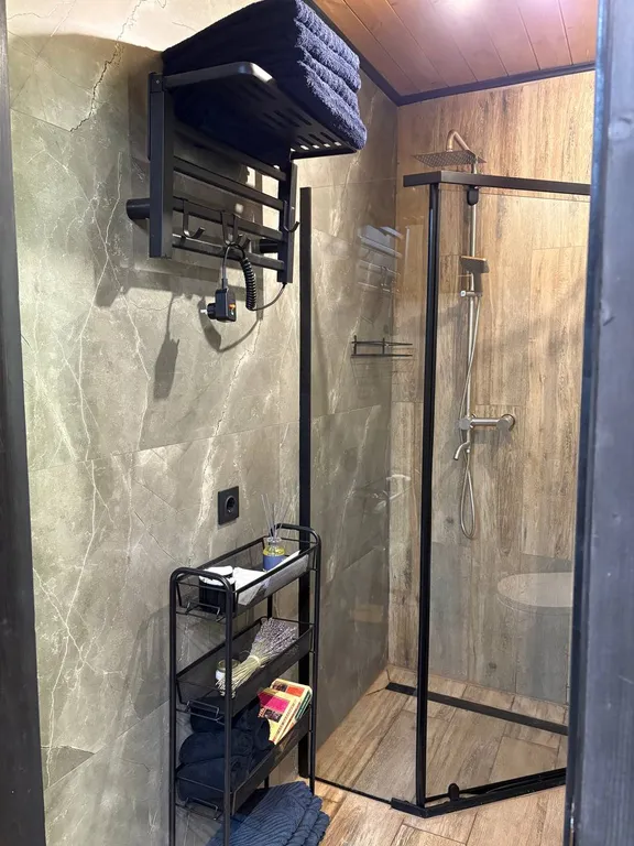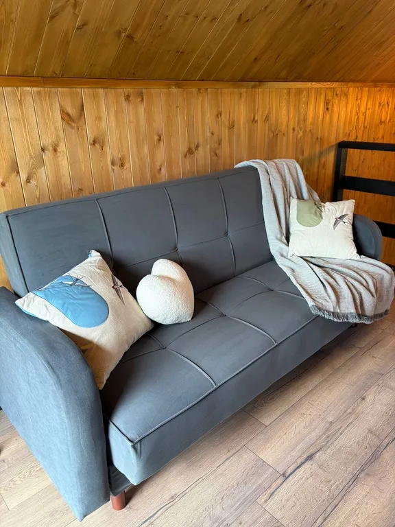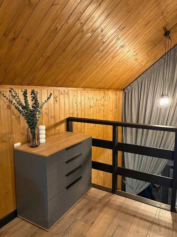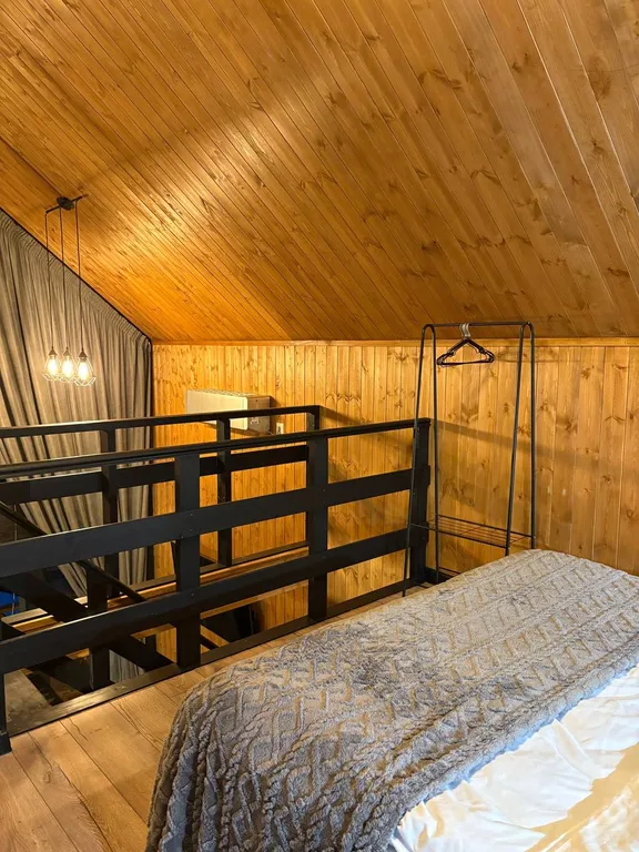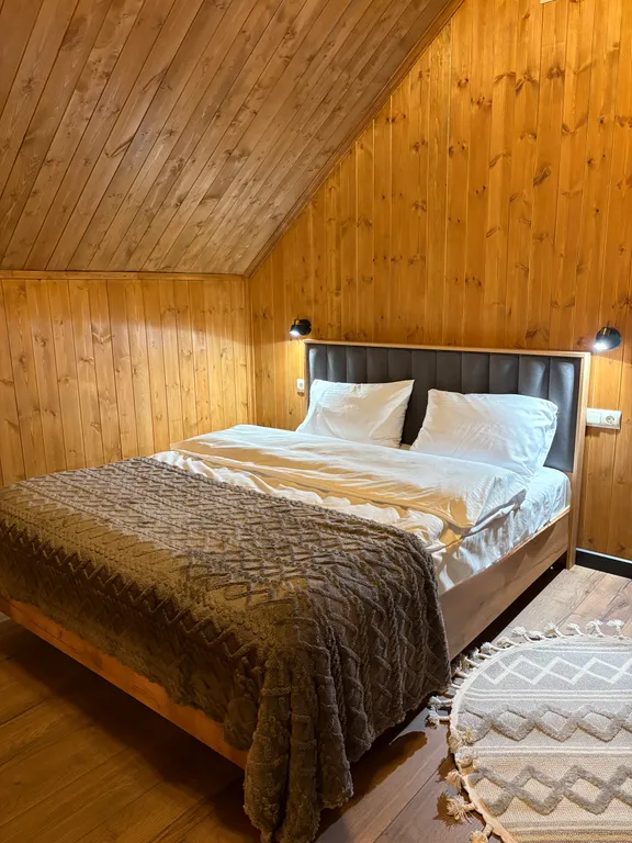 На втором этаже находится спальня с двуспальной кроватью и дополнительным местом для отдыха (диван). Ванная комната оснащена душевой кабиной, полотенцами и средствами гигиены. Для вашего удобства предоставляется постельное бельё, полотенца. Вся необходимая посуда и принадлежности для мангала.