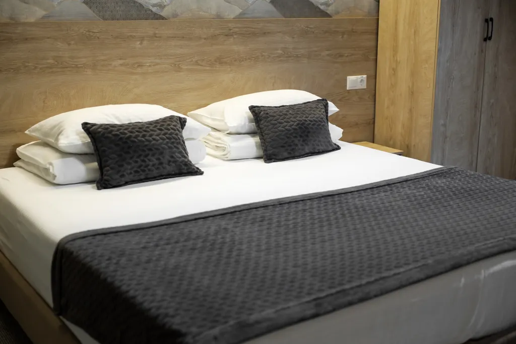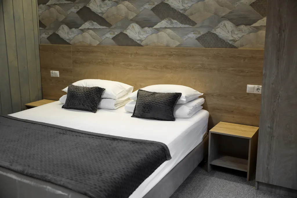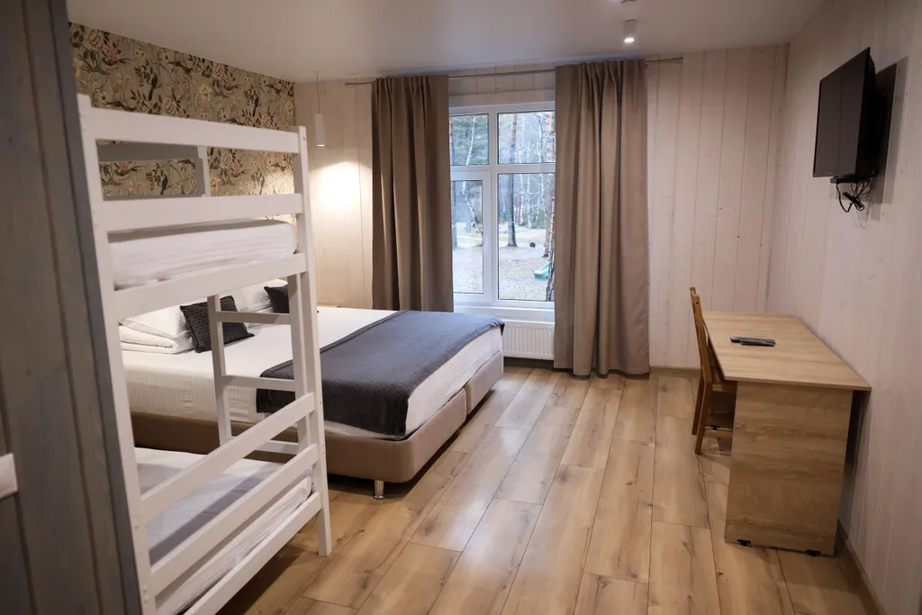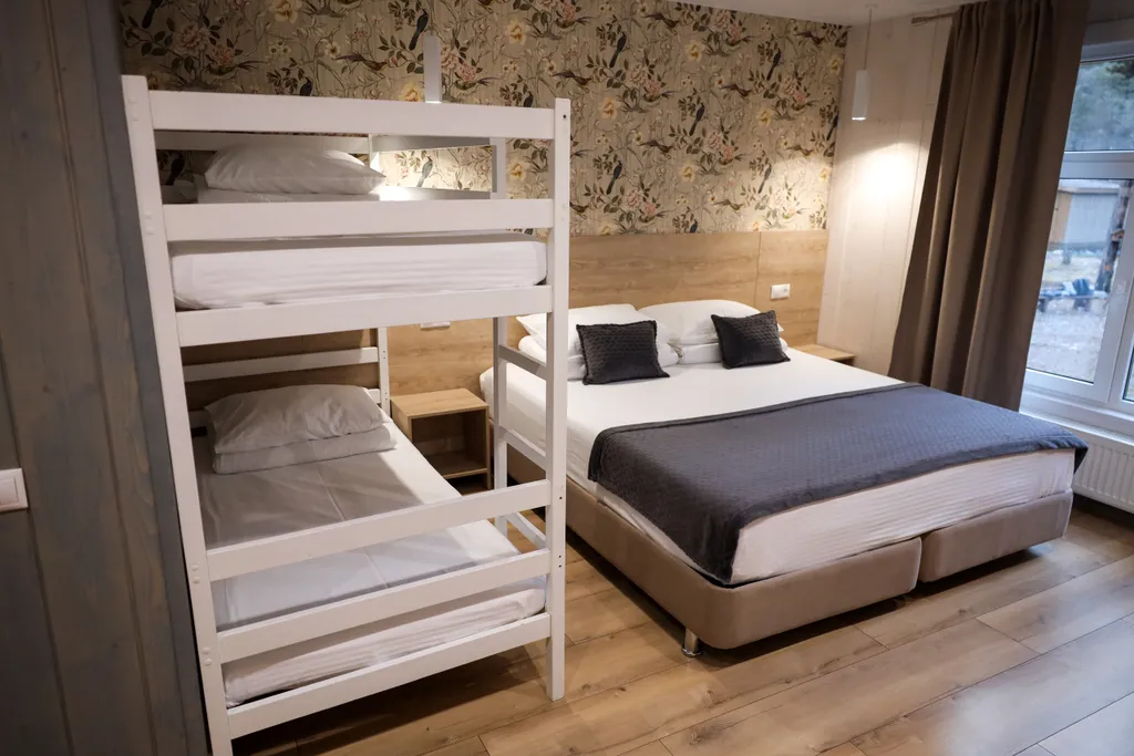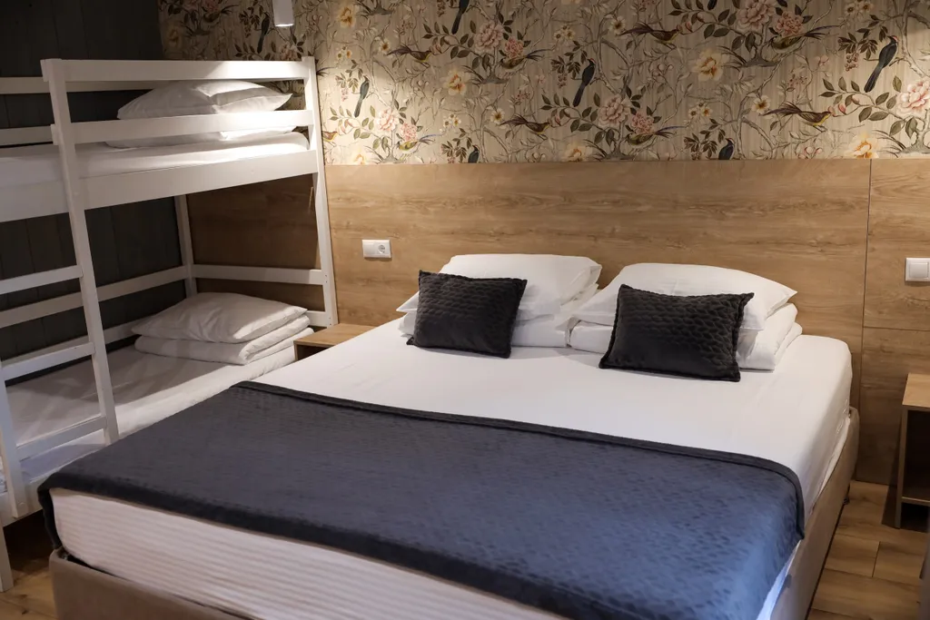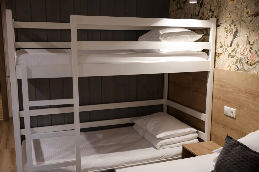 •Три комнаты на четверых: двуспальная кровать и двухъярусная кровать.