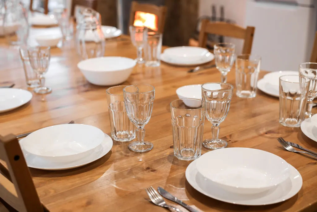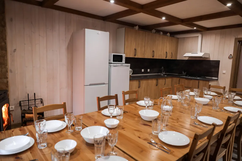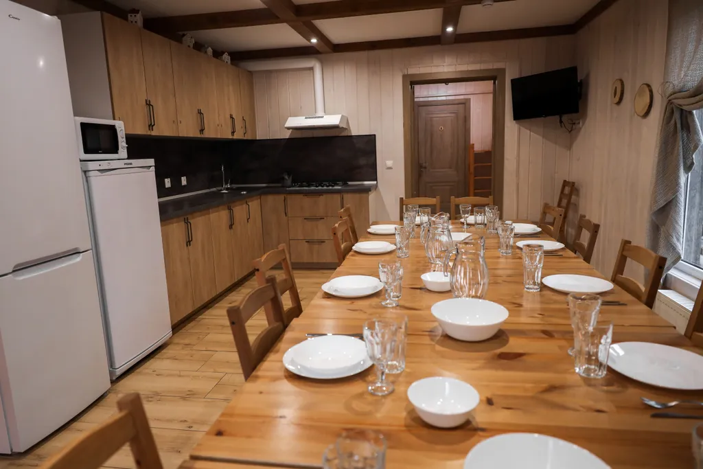 Оснащение кухни: холодильник, микроволновка, чайник, сковородки, кастрюли, столовые приборы, посуда, кружки, стаканы, бокалы, рюмки.