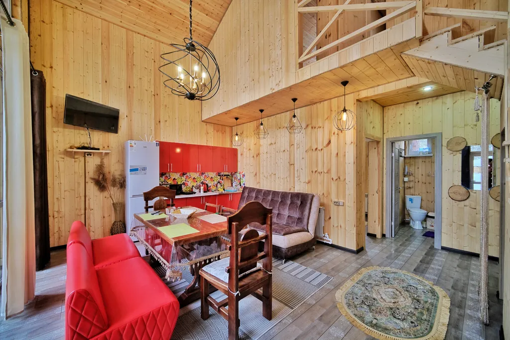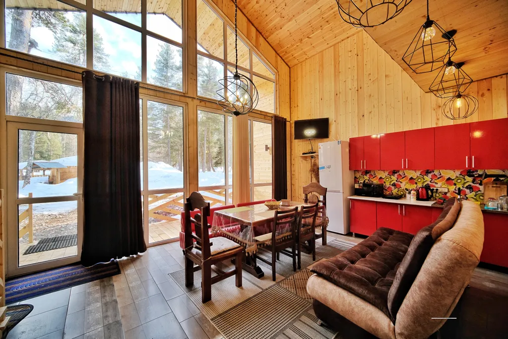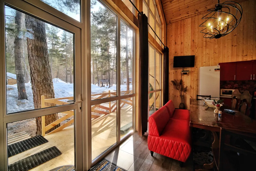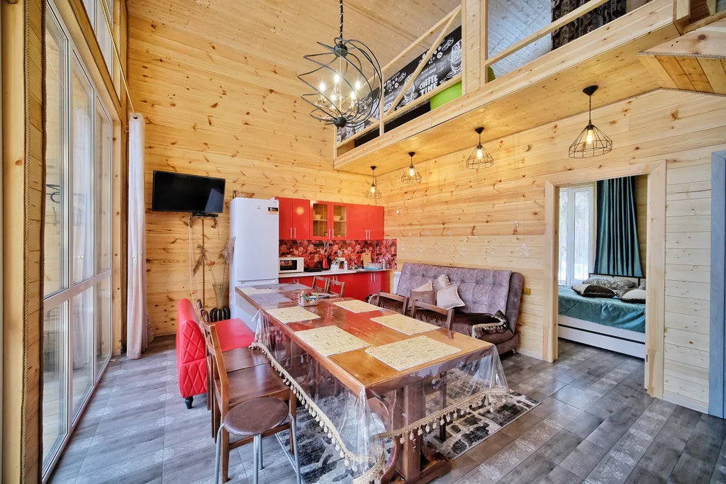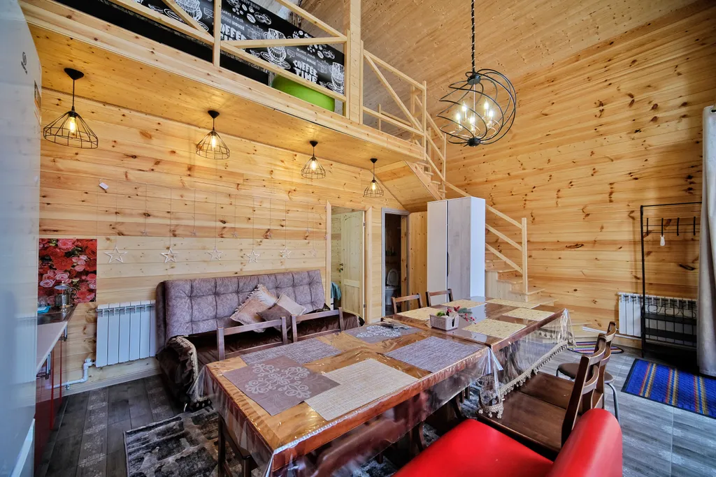 В числе удобств — микроволновая печь и эл. чайник. Гости могут отдохнуть на собственной террасе и воспользоваться принадлежностями для барбекю. Мангальная зона рядом. Летом на территории обустроена детская игровая площадка. Зимой в шаговой доступности горка для катания на тюбинге. Парковка бесплатная рядом с виллой