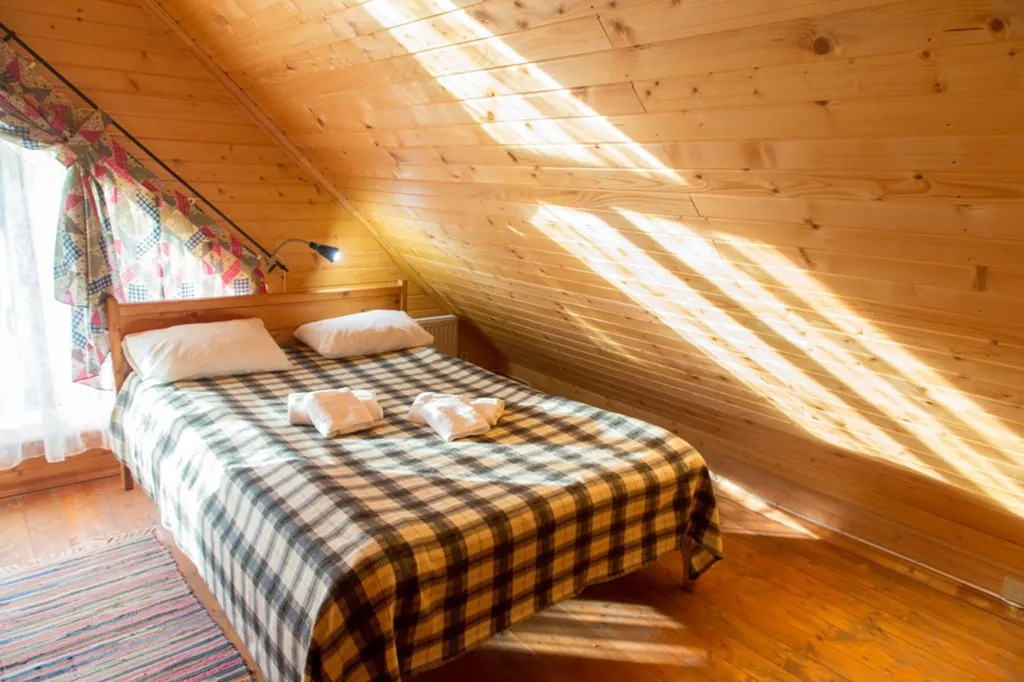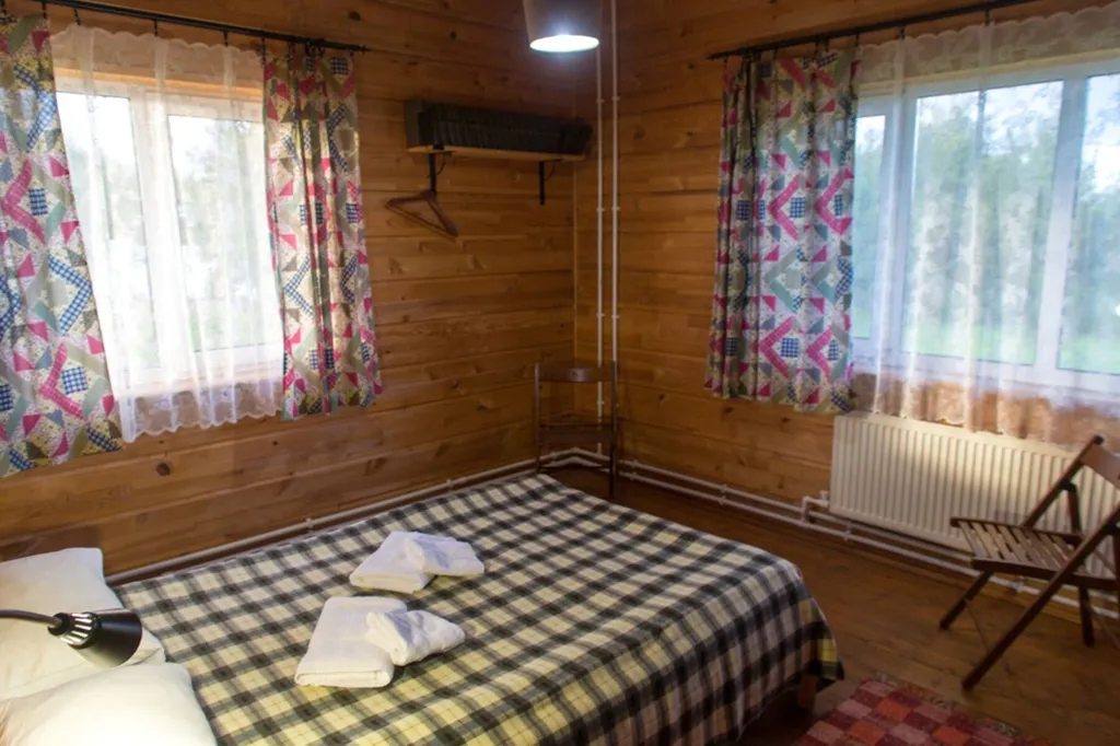 Двухэтажный коттедж. На 1-ом этаже: совмещенный с/у, две спальни с двухместным размещением, кухня- гостиная с диван- кроватью. На 2-ом этаже: с/у, две спальни с трехместным размещением (двуспальная и односпальная кровати), одна спальня с одноместным размещением.