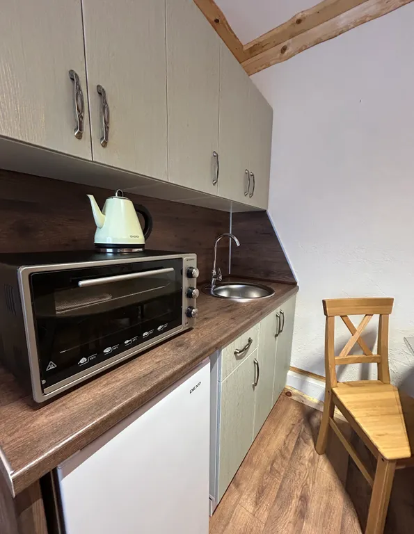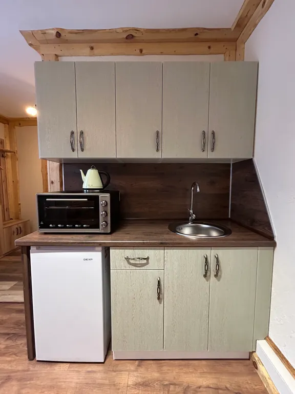 Полностью оборудованная кухня: вся необходимая посуда, СВЧ‑печь и всё, что нужно для лёгкого приготовления и разогрева блюд. Самой плиты нет, вместо неё — СВЧ‑печь.