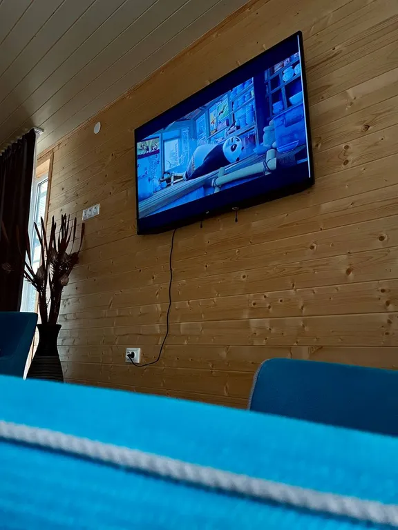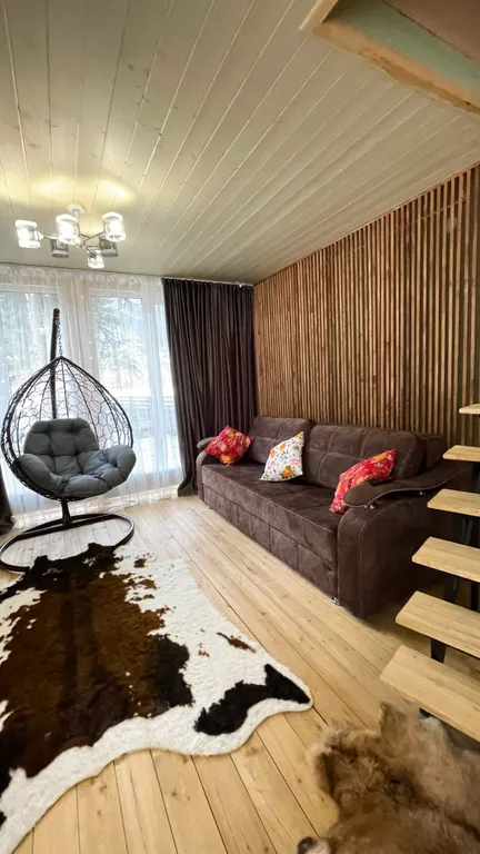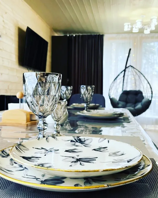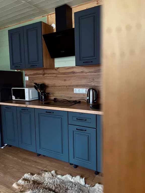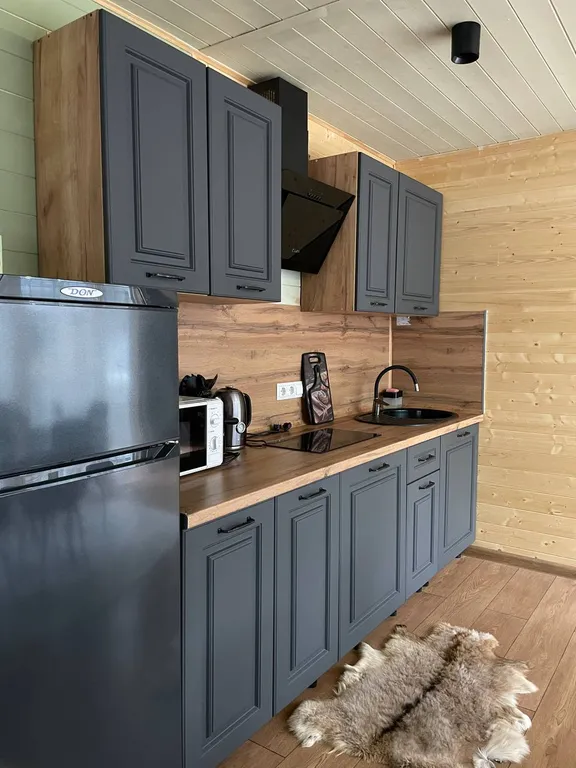 Кухонный гарнитур, холодильник, чайник, вытяжка, варочная панель, микроволновая печь, большой стол, стулья, телевизор подвесная качеля, двуспальный диван, совмещённый санузел.