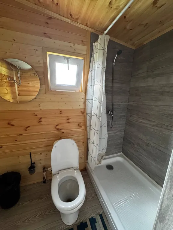 В домиках с панорамными окнами есть спальня, кухня-гостиная, ванная комната, прихожая и веранда.