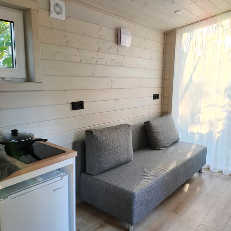 - Кухня-гостиная с диваном (раскладывается) и телевизором, оборудованная плитой, чайником, посудой и мини холодильником.