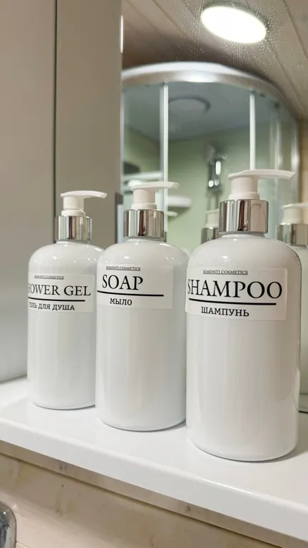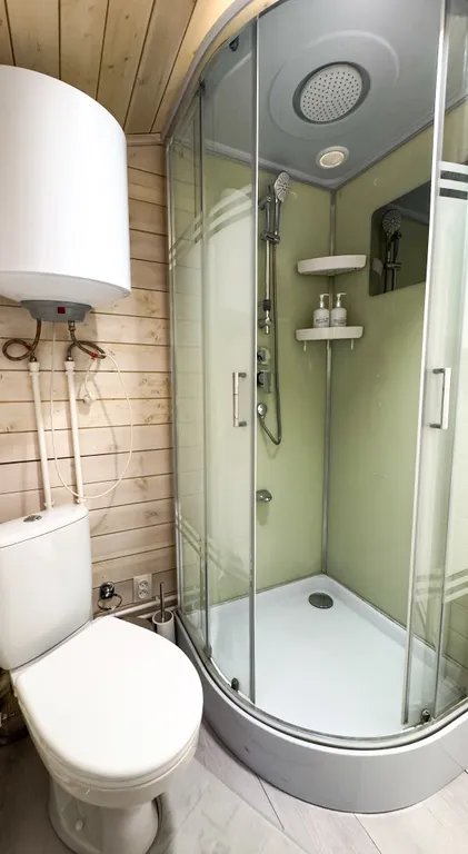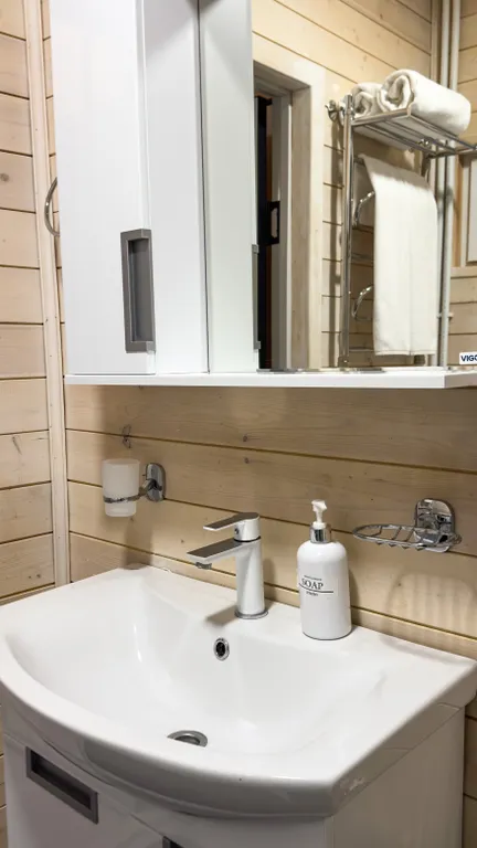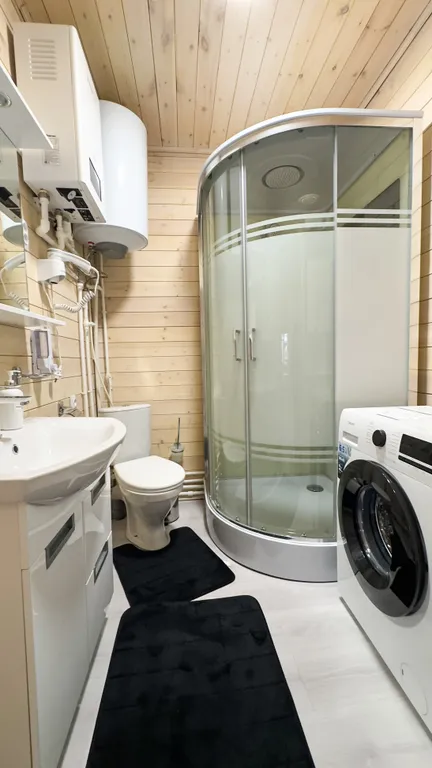 В ванной комнате находится душ, туалет и раковина, тапочки, фен, ванные принадлежности, а так же стиральная машина.