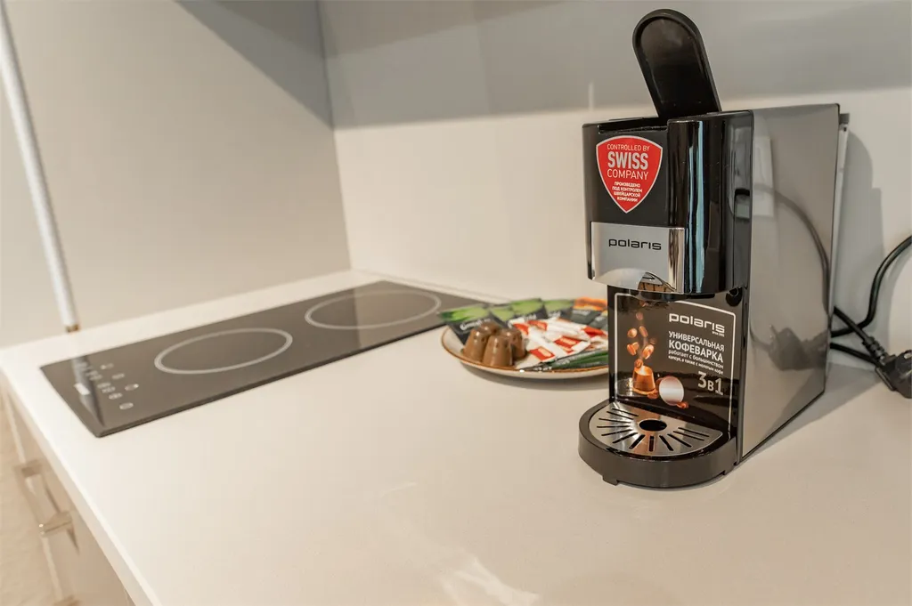 Кухня-гостиная: кухня оснащена всей необходимой техникой, кофемашина, посудомоечная машина, посуда, здесь же расположена уютная гостиная с диваном и столовой зоной.