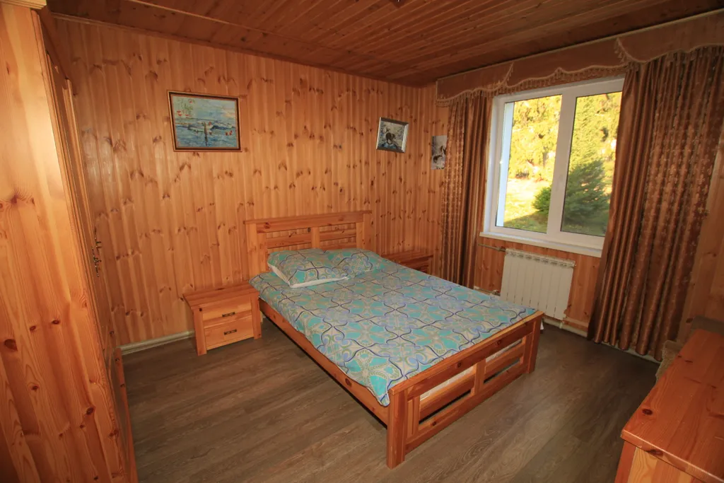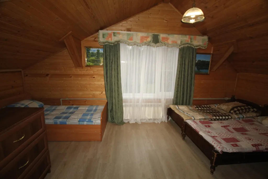 В доме на первом этаже три спальных комнаты с двуспальными кроватями, на втором этаже одна спальная комната с четырьмя односпальными кроватями застеленным бельём и полотенцами.