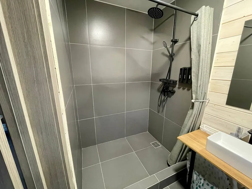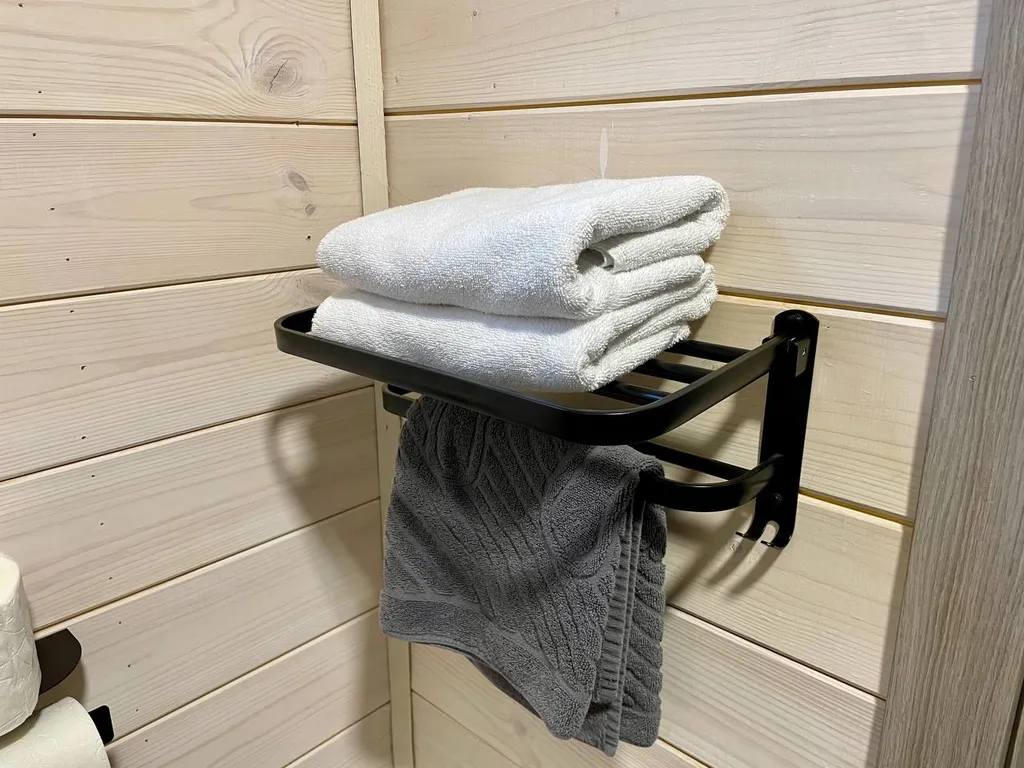 Санузел с душем, феном, полотенцами и всеми необходимыми косметическими принадлежностями бренда Grass.