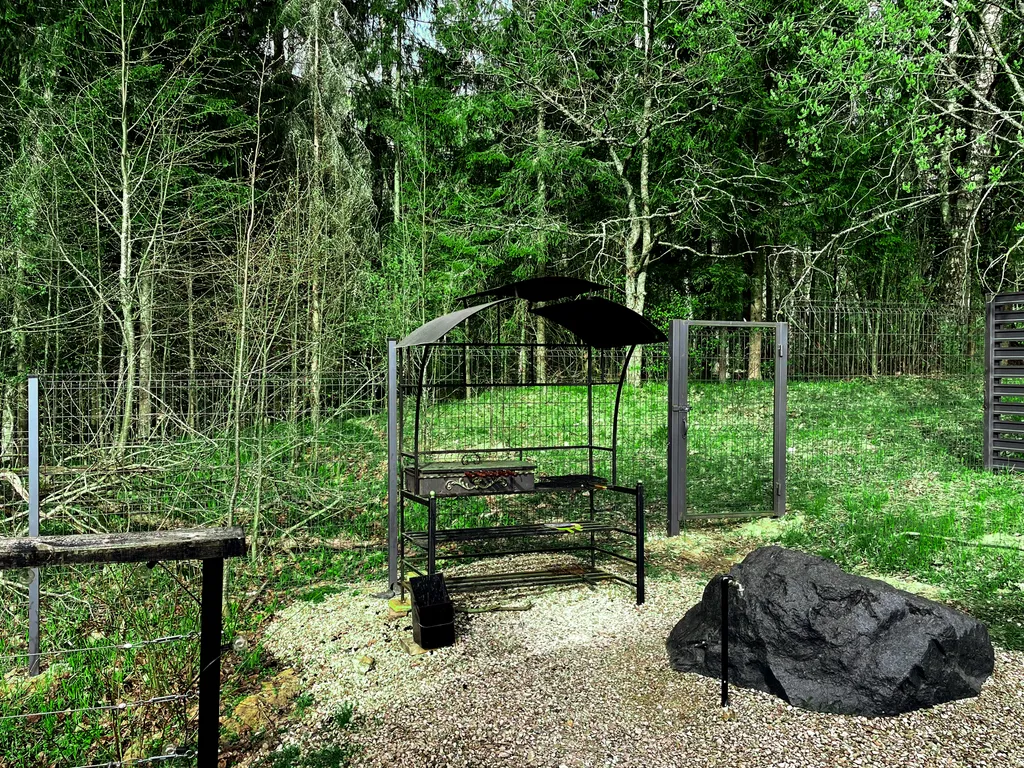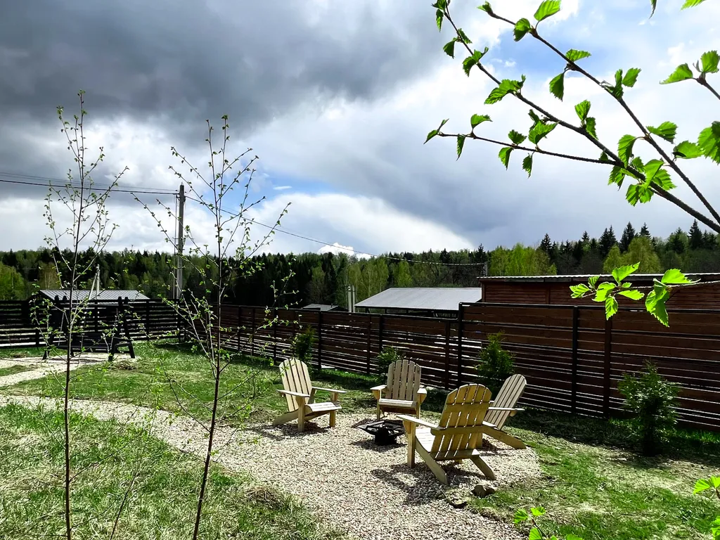 Территория дома огорожена. Костровая/мангальная зона и парковка у дома.