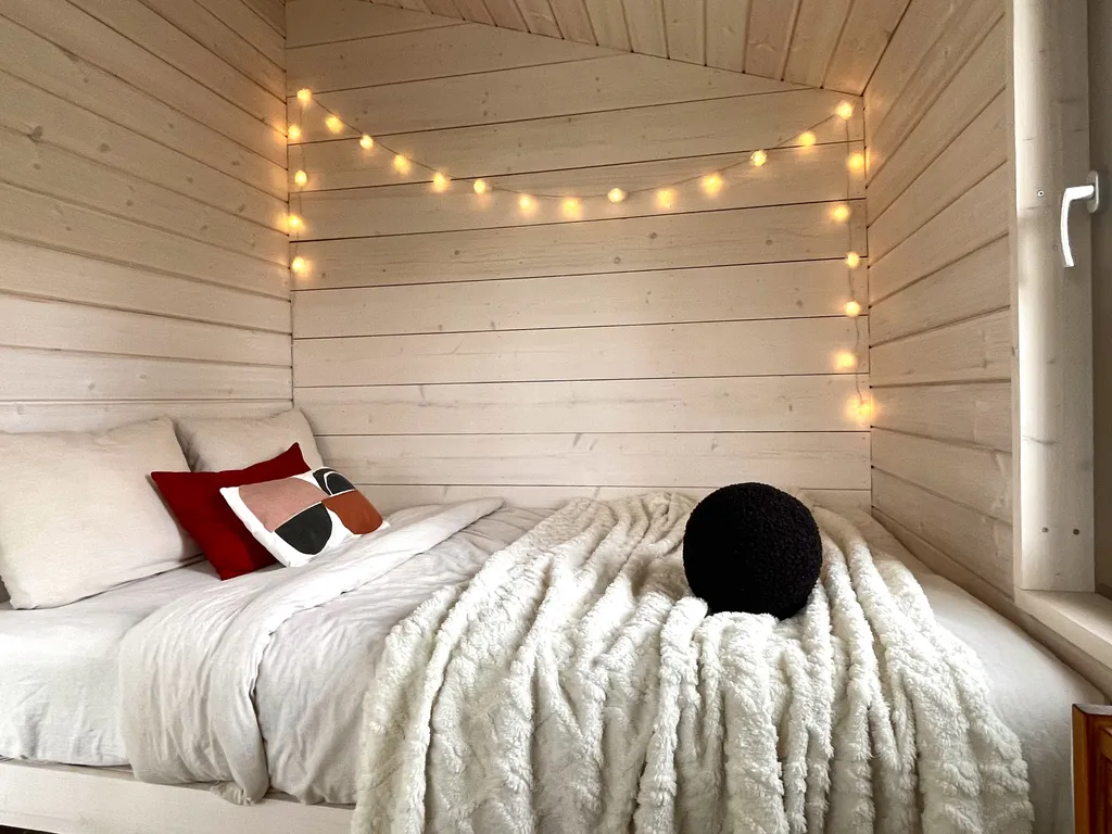 В доме есть отдельная спальня с двуспальной кроватью, а в просторной гостиной находится раскладной диван. По запросу установим детскую люльку.