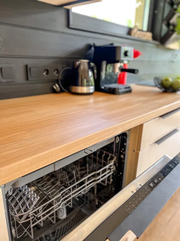 Полностью укомплектованная кухня: чайник, тостер, кофемашина, индукционная плита, микроволновка, посудомоечная машина, посуда на 4 персоны. Соль, сахар, чай-кофе, растительное масло — тоже есть)