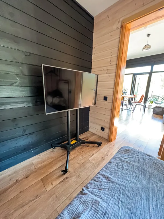 Есть Wi-Fi и передвижной телевизор — можно использовать в спальне или гостиной, а также виниловый проигрыватель и умная колонка «Алиса».
