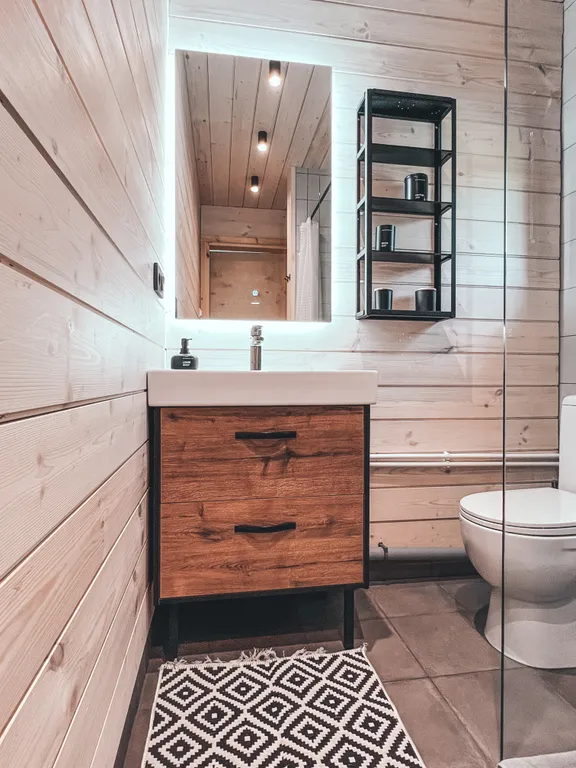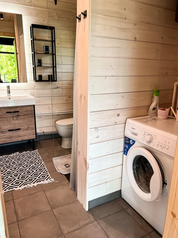 В доме также есть современный санузел с душевой кабиной и стиральной машиной, для удобства — полотенца, фен и все необходимые средства гигиены.