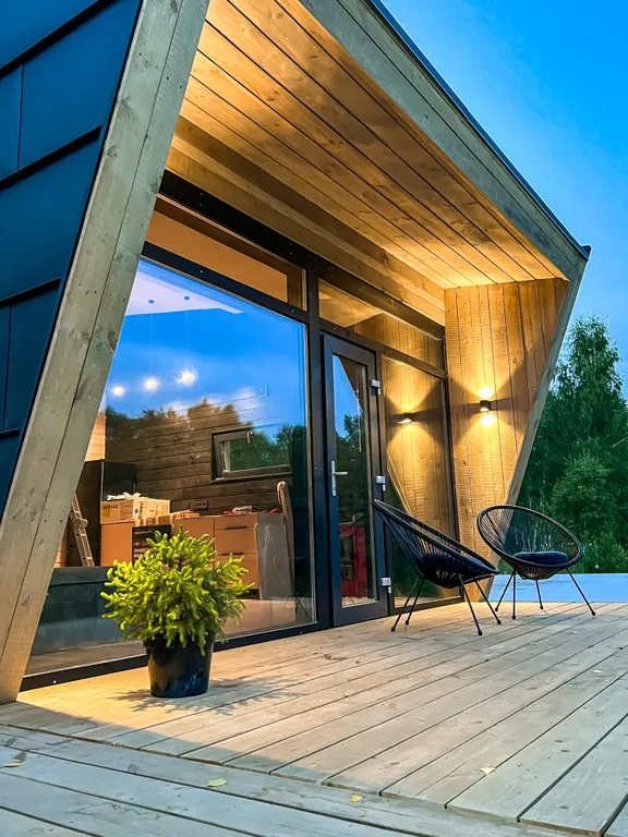 Необычный дом-ракушка с интересным дизайном снаружи и интерьером внутри. Нам хотелось чего-то, что позволит шире дышать. Таким образом, выбрали для постройки дом с большой террасой и невероятных объемов лесной панорамой.