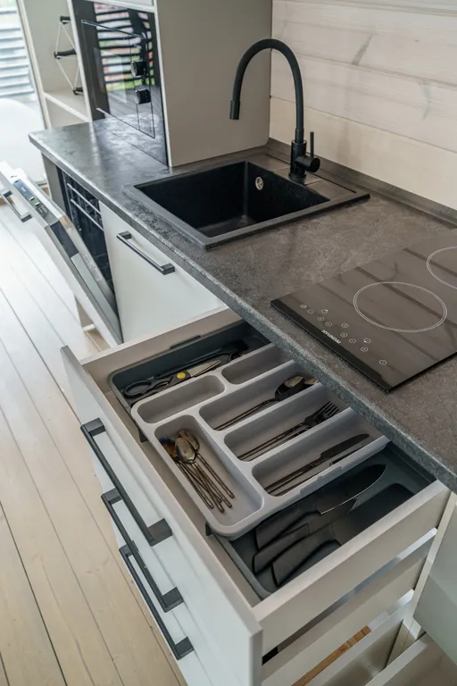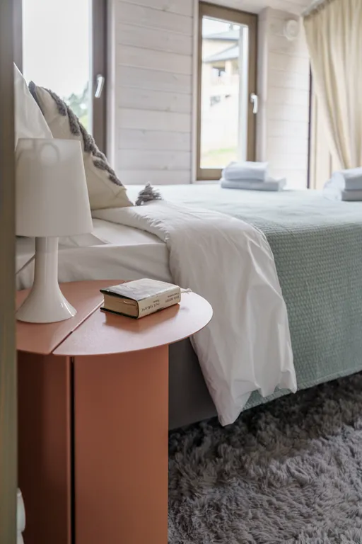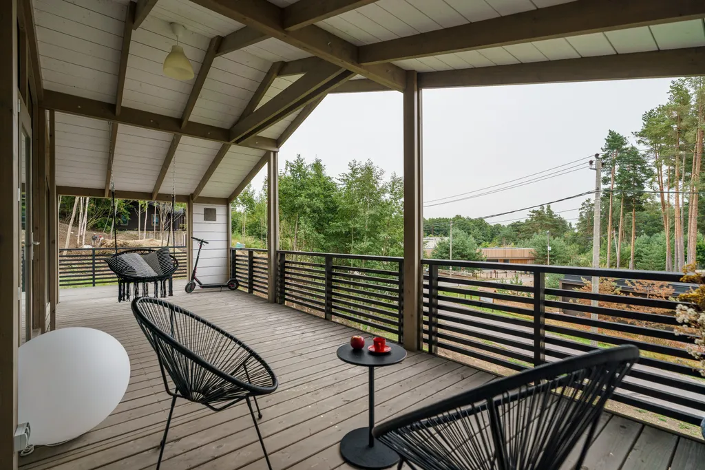 Большая и светлая кухня-гостиная с двуспальным диваном; две спальни с двуспальными кроватями; обособленный уголок для чтения у входной группы с раскладывающимся креслом- кроватью, который может стать третьей спальней или кабинетом; просторная ванная комната с с/у и открытая веранда.