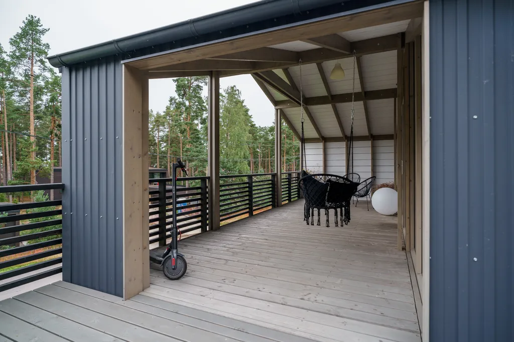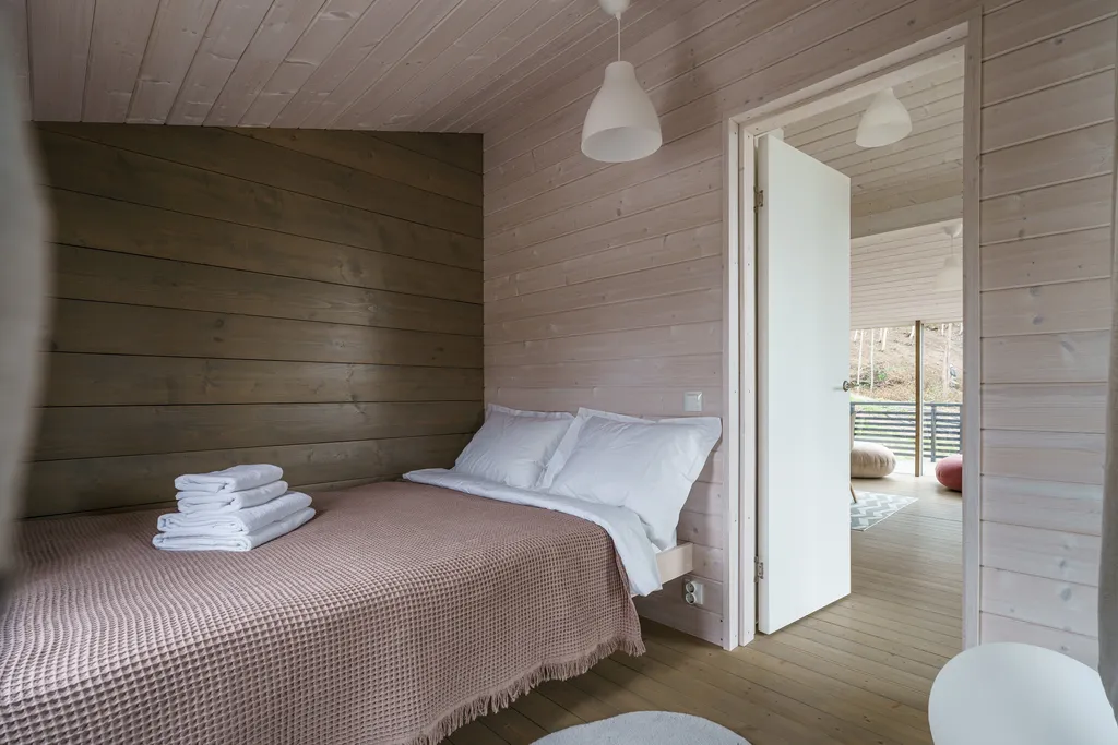 Панорамное остекление позволяет наслаждаться видами природы, создавая ощущение единства с окружающим миром. Дома пространства словно парят в воздухе, открывая вид на вековые сосны и залив.
