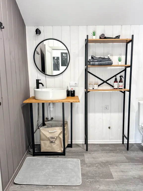 В доме также есть современный санузел с душевой кабиной и полотенцесушителем, для удобства – полотенца, фен, шампунь, кондиционер и гель для душа.