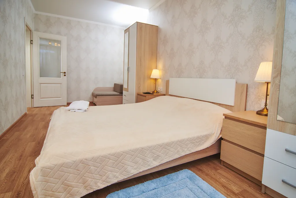 — спальня: два бельевых шкафа, широкая двуспальная кровать 160х200 см, рабочий стол, тв (кабельное hd, фильмотека), wi-fi.